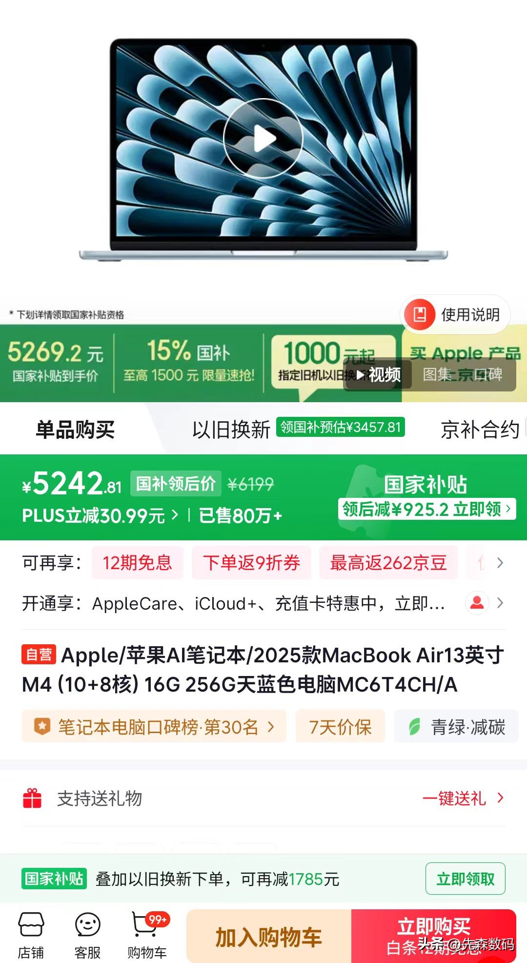 我们再来看看老款的M4芯片MacBook Air,目前最低配的16+256G版本价格国补后也就5000出头(M5发布后,M4的价格还会持续走低),比MacBook Neo也就贵了一千来块钱。但是从性能、屏幕和音质、麦克风等配置来看,都要强上不少。