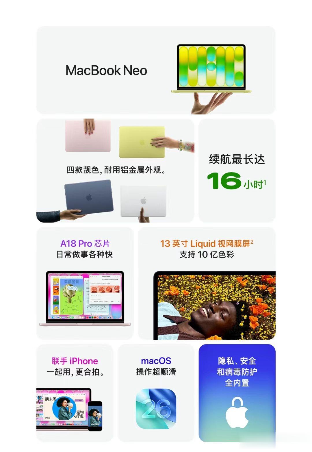 就在昨晚,苹果上架了传闻中的廉价版入门级MacBook,不过命名并不是叫MacBook SE,而是MacBook Neo