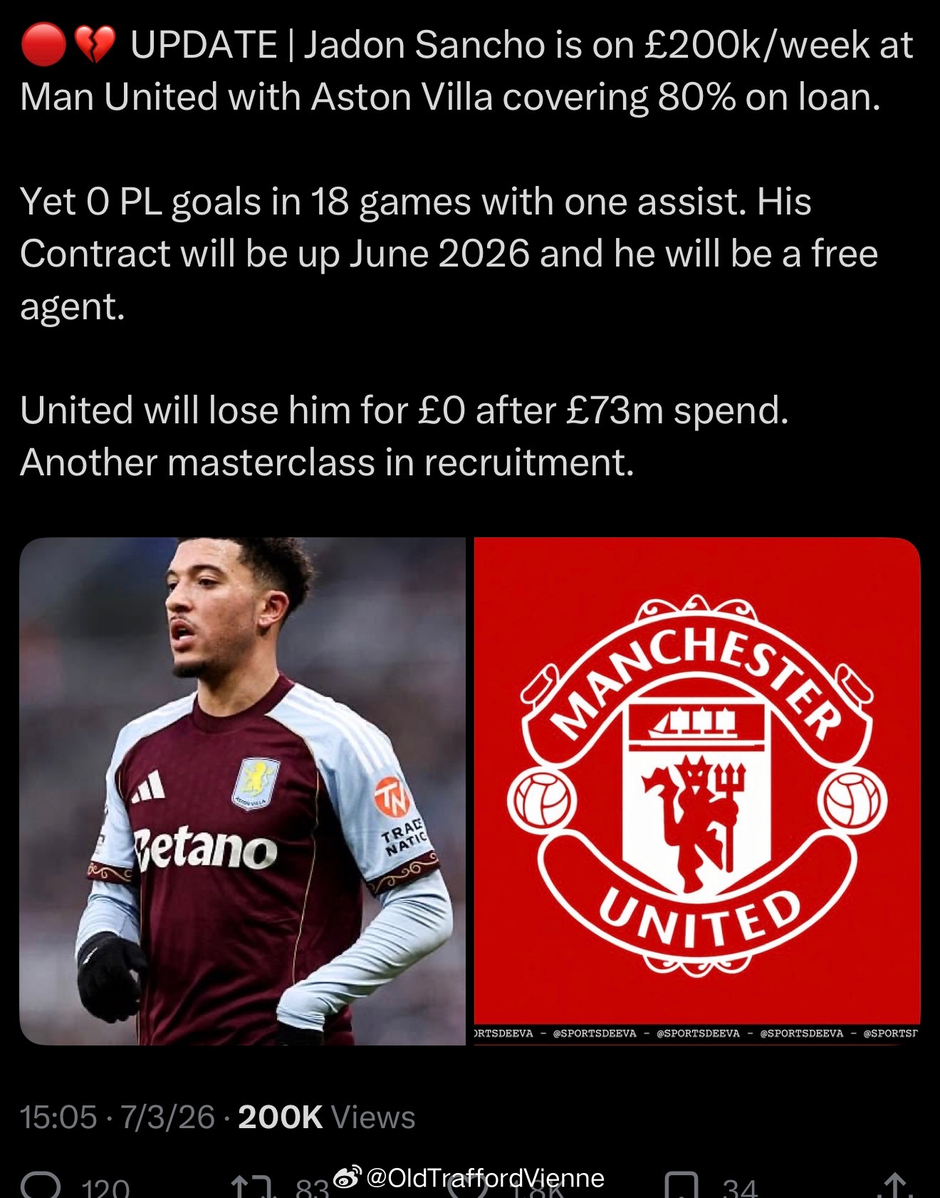 租借在维拉的自由桑在曼联时周薪20万,外租期间维拉承担80%,为维拉踢了18场比赛,0进球1助攻。6月份他与曼联的合约到期,曼联为引进球员花了7300万,一分也收不回来。曼联引援操作如果有黑榜,桑乔的引进能进前五吗