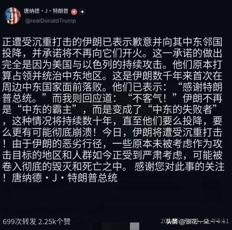 最新消息!特朗普刚睡醒就开始发帖! 美国时间3月7日早上6:11分,特朗普发了一个帖子,应该是回应伊朗总统说不再首先攻击邻国,除非遭到来自邻国的攻击,否则伊朗不会攻击邻国。 从特朗普发的帖子内容可以看出,好像美国已经赢了一样,其实现在战场上不是打的还很激烈吗?伊朗“真实承诺—4”第24轮行动都开始了。 而且据俄罗斯卫星通信社报道,伊朗总统回应特朗普有关伊朗无条件“投降”的言论纯属幻想,他们应该把这种幻想带进坟墓。”