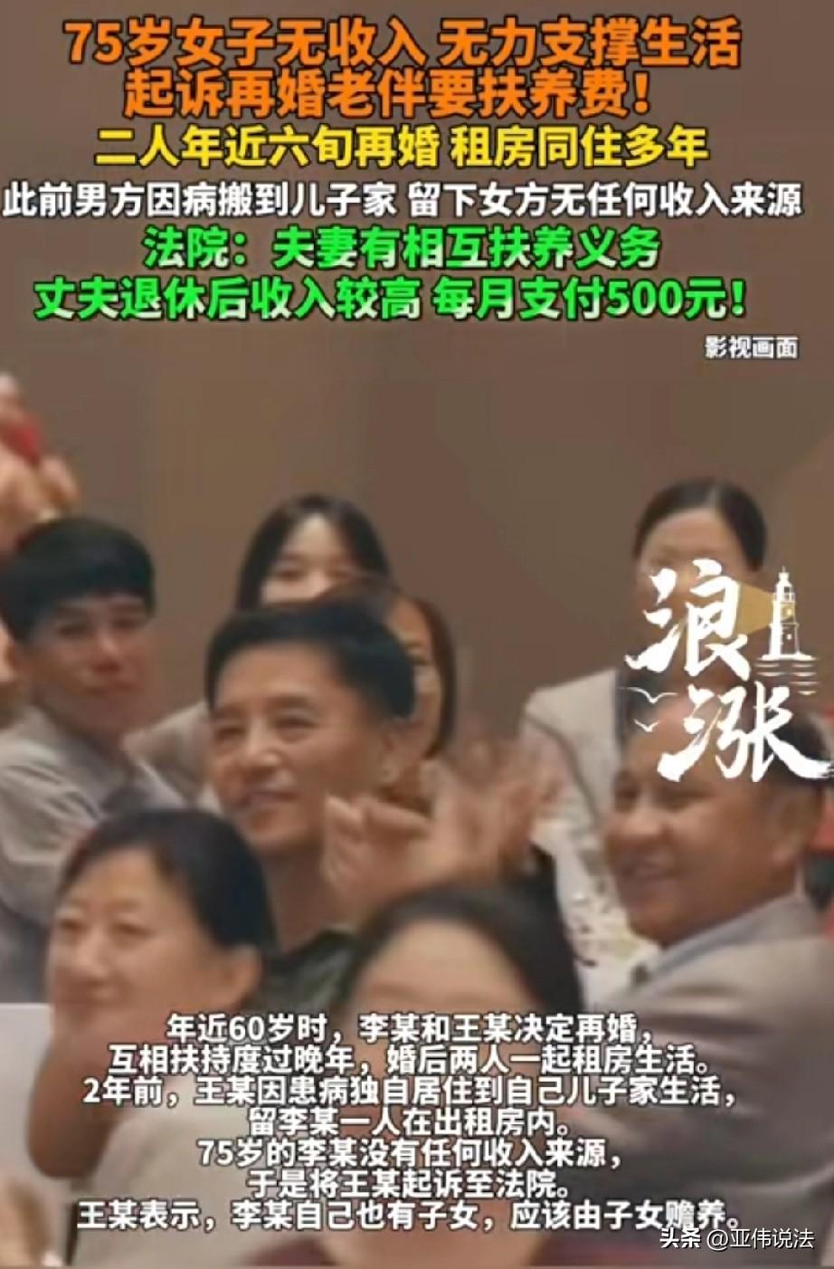江苏淮安,大爷大妈60岁时再婚,为了不拖累儿女,租房在外面住。本以为能安度晚年,谁知十几年后,大爷体弱多病,被儿子接走照顾,把75岁的大妈一个人留在了出租屋里。她孤苦伶仃又没有收入,生活都成了问题,就想问大爷要抚养费。谁知大爷冷漠的表示:你有儿女,找你儿女去。伺候她十来年却换来如此结果,大妈心寒,告上法庭。 都说少来夫妻老来伴,李大爷和王大妈年轻时不认识,在快60岁的时候经人介绍走到了一起。 那会儿两人想得都挺简单,儿女都成家了,自己一个人孤零零的,不如找个伴儿,互相有个照应,安安稳稳过完剩下的日子。 结婚后,俩人没给子女添麻烦,老两口租了个小房子住。 李大爷有退休工资,每个月不少钱,王大妈没啥收入,就负责在家做做饭、洗洗衣服。 李大爷常说,他两要好好过,养好身体,尽量不给两边孩子添麻烦。听了这话,王大妈心里很踏实,觉得这后半辈子算是找对了人。 这一过,就是十多年。 王大妈以为日子就这么过下去了,虽说不是啥大富大贵,但有个说话的人,有个一起吃饭的人,比一个人冷冷清清强多了。 可两年前,李大爷身体出了毛病,越来越差,他儿子不放心,非要把老爹接回自己家照顾。 李大爷一走,就剩王大妈一个人守着那间出租屋。 刚开始李大爷还打个电话,问问她咋样。后来电话越来越少,再后来,干脆没音信了。 王大妈的日子,一天比一天难。 她没有退休工资,年轻时打零工,老了就靠着李大爷的退休金过日子。以前李大爷在,俩人吃喝不愁。 现在他走了,钱也跟着断了。她翻遍屋里,就剩几百块钱,交完房租,连吃饭都成问题。 她不好意思跟自己的儿女开口,当初再婚的时候,孩子们就不太乐意,怕她吃亏,现在真吃亏了,她哪有脸回去? 有时候夜里睡不着,王大妈躺在那个冷冰冰的出租屋里,越想越委屈。 当初结婚图啥?不就是图老了有个依靠吗?现在倒好,十多年伺候下来,人走了,自己连口饭都吃不上。这晚年可怎么过? 实在走投无路,她把李大爷告上了法庭,毕竟两人是领过证的夫妻,她希望李大爷能支付扶养费。 李大爷不乐意了,她自己明明有儿女,凭啥不让她儿女养?再说我都病成这样了,自己还得靠儿子养,哪有钱给她? 《民法典》第一千零五十九条规定:夫妻有相互扶养的义务。需要扶养的一方,在另一方不履行扶养义务时,有要求其给付扶养费的权利。 李大爷与王大妈登记结婚,婚姻关系合法有效,夫妻相互扶养义务依法成立。 王大妈年事已高、无收入来源,生活困难,属于需要扶养的一方;李大爷有退休工资、具备扶养能力,其以王大妈有子女为由拒绝履行扶养义务,不符合法律规定。 法院经过调解,最终李大爷同意,每月给王大妈500块钱抚养费。钱虽然不多,但至少能让她吃上饭。 年轻时候吃苦,老了以为能享点福,没想到临了临了,还得靠打官司才能从老头那儿要点生活费。 这老伴儿,到底是伴儿,还是伴了个寂寞? 夫妻本是同林鸟,大难临头各自飞。这话说的没毛病,尤其是再婚夫妻,好像更难经得起考验。 李大爷这事儿办得确实不地道,两个人风风雨雨过了十几年,从快60岁熬到70多岁,最苦最难的日子都一起扛过来了。 结果自己一病,被儿子接走,就把老伴儿扔在出租屋里不闻不问,十几年的情分,说断就断。 这确实是"各自飞",而且飞得挺绝情。 客观地说,再婚夫妻和原配夫妻,面对的情况确实不太一样。 原配夫妻,有共同的子女,有几十年攒下的共同财产,有盘根错节的亲戚关系。这些就像一条条绳子,把两个人紧紧捆在一起。 若真出事了,想飞也飞不走,就算想飞,儿女、亲戚、周围人的唾沫星子也能把他淹死。 但再婚夫妻呢?往往是半路结合,各自有各自的孩子,财产也多多少少分得清楚,两个人在一起,图的就是有个伴儿,互相照应。 这种关系,好起来也好,但真遇到事儿,比如一方病重、一方没钱,感情就容易受到考验。 儿女们也会下意识地替自己亲爹亲妈打算,就像李大爷的儿子,把老爹接走自己照顾,觉得是天经地义,可想过那个被扔下的王大妈吗? 既然选择了再婚,选择了领那张证,那就意味着彼此有了责任,不管头婚二婚,领了证就是一家人,就得互相扶持。 李大爷的退休金高,王大妈没收入,她就得靠他,这是法律规定的夫妻相互扶养义务,也是做人的基本良心。