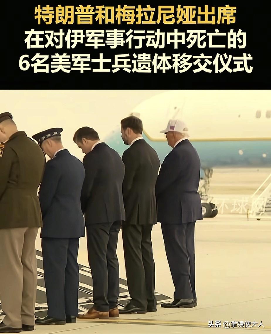 美国空袭伊朗8天了,才阵亡6个士兵! 特朗普和夫人梅拉尼娅,十分悲伤的在多佛空军基地,参加6名士兵的遗体移交仪式! 美军中央司令部,在2号就对外公布已经有6名士兵在对伊朗军事行动中阵亡,现在都已经8号了,这个数字还停留在6名。 7号当天,特朗普和夫人一起来到了多佛空军基地,这个基地主要就是负责海外阵亡的军人遗体移交。 6名士兵遗体被抬出来后,特朗普敬礼,第一夫人梅拉尼娅表情严肃,低头默哀,还特意换上了一身黑色衣服。 有意思的是,美国方面对外仅仅称只阵亡了6名士兵,但是伊朗军方在7号当天就发布了一个新闻,伊朗的导弹袭击了美国位于阿联酋的基地,至少造成200名美国军人死伤。 美国公布的阵亡人数和伊朗发布的新闻,中间的差距太大了,也不知道到底谁在撒谎。 伊朗已经打了27轮了,轰炸了那么多美军在中东的基地,如果真是就打掉了6名美军,那这导弹也太一般了。