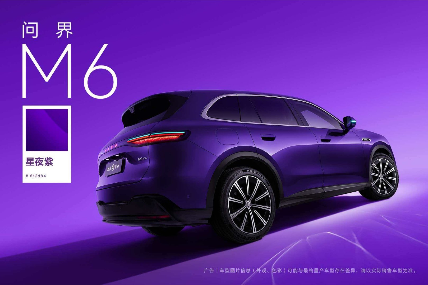 问界M6,星夜紫。紫色大年,这个高饱和度的紫色也好看。前面大灯这么闪的么新锐王牌问界M6七色亮相