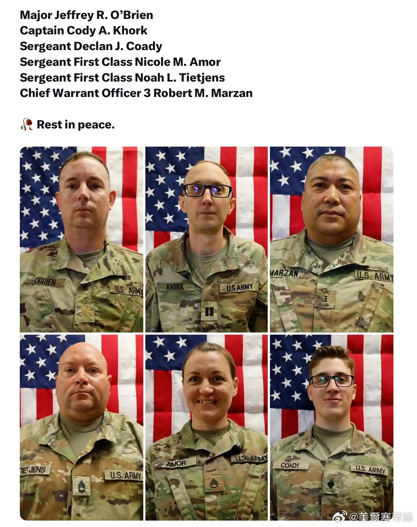 “我們國家沈痛悼念六位非凡的美國英雄。這些勇敢的戰士為國捐軀,全力支持"史詩之怒"行動。傑弗里·R·奧布萊恩少校。科迪·A·霍克上尉。