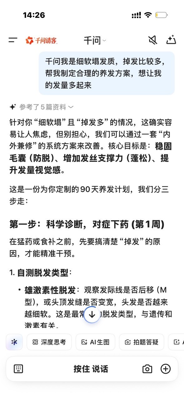 姐妹们用千问AI下单快乐过节 每个女孩都是天上掉下来的星星✨呀~38节我要从“头”开始爱自己!这次试着用千问给我做了一套超详细的养发计划,作息、洗护、饮食全都被安排得明明白白,坚持下去发量感人不是梦^ ^~重点现在上千问还能领AI办事卡体验一句话下单,我直接买了一瓶防脱发的洗发水,无门槛立减还是很香的 ~千问你是真的在给我们广大女生办事呀!
