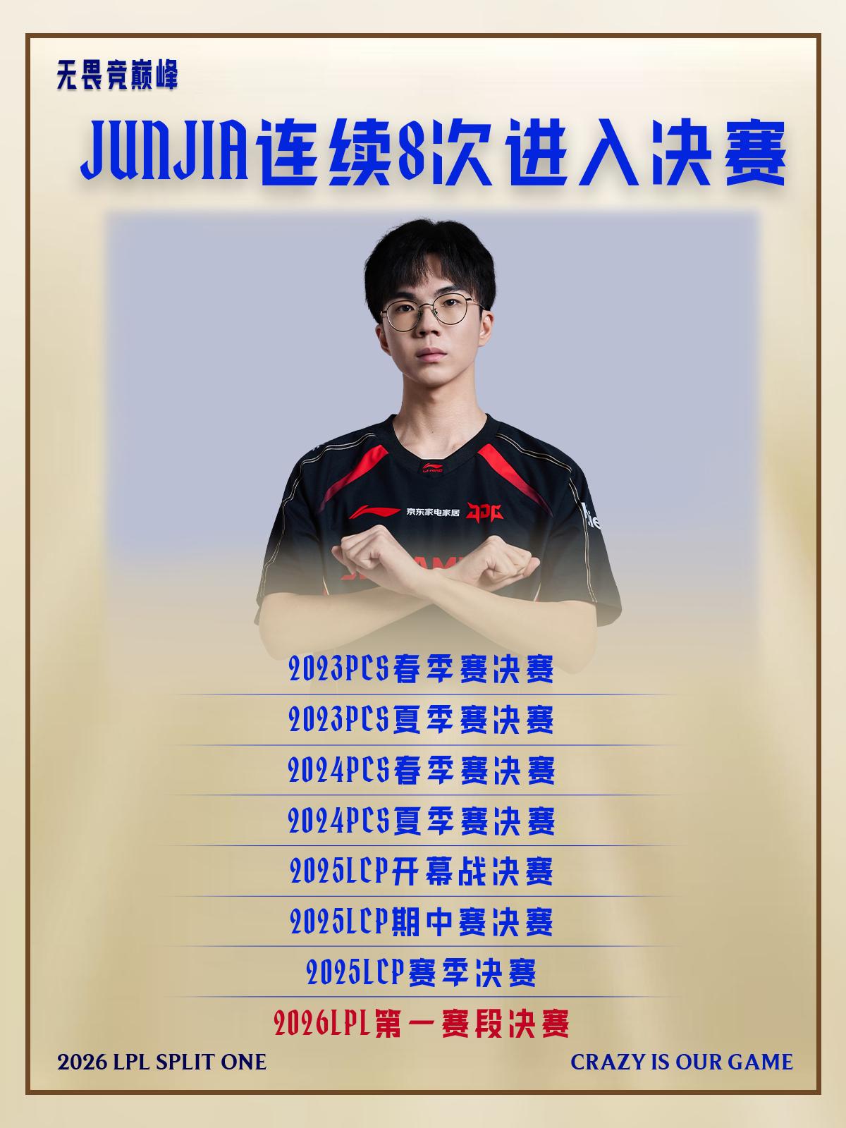 自2023PCS春季赛开始,JunJia连续8次进入所在赛区决赛。