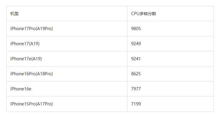 iPhone 17e在Geekbench 6数据库的跑分公布了,多核CPU性能为9241分,和iPhone 17的9249分差不多;图形处理能力上,虽然比iPhone 17少了一个核心,但差异比较微小,大约在31000到31500分左右,比iPhone 17的37000分少一点。iPhone等级森严是事实,就iPhone 17e的性能表现而言,也算是很强的了