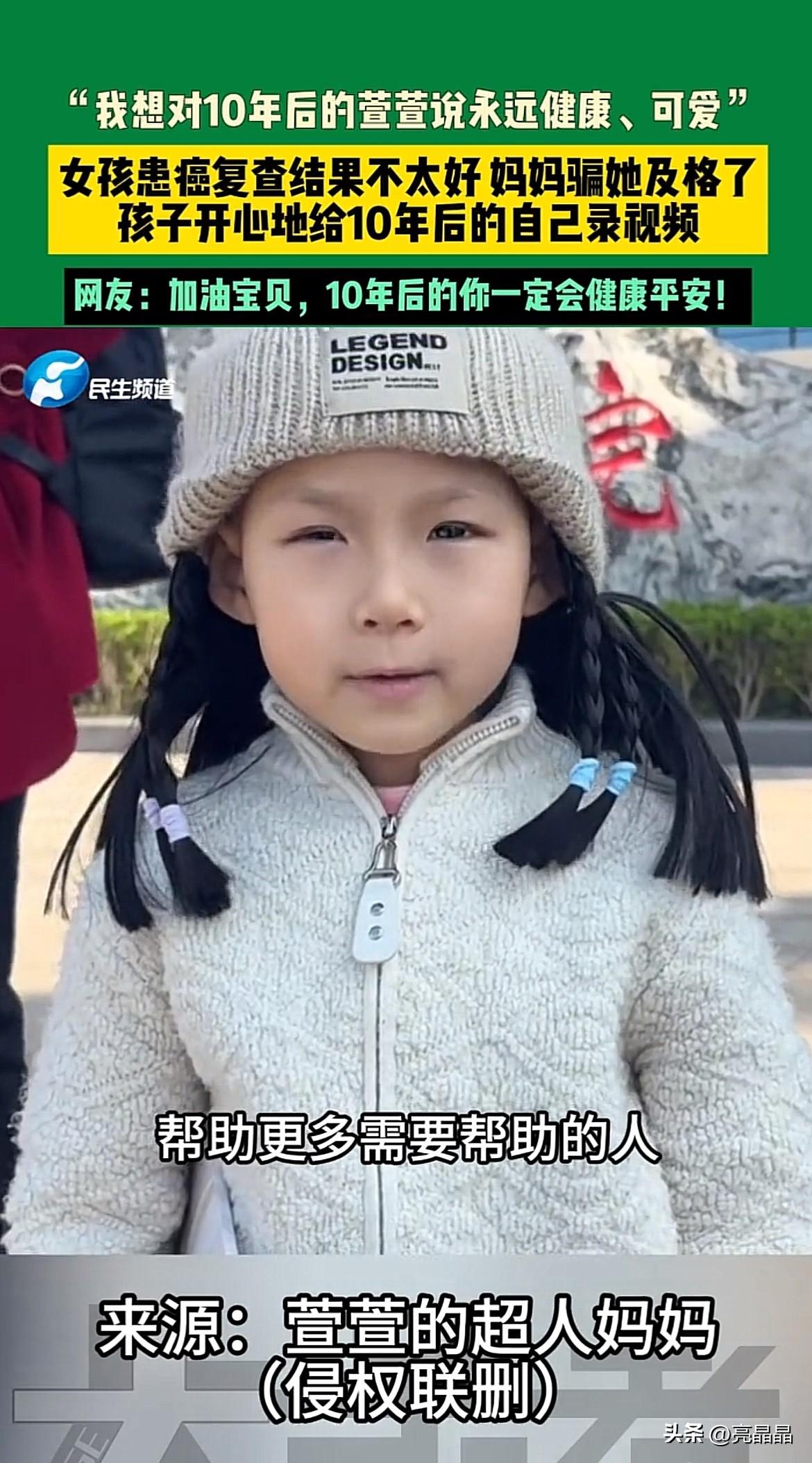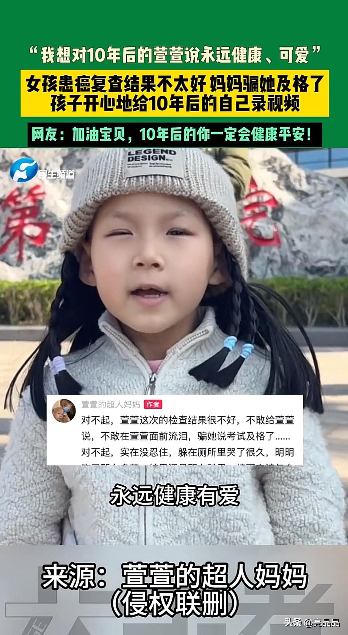 泪目了!重庆,一小女孩患癌复查结果不太好,妈妈撒善意谎言,骗女孩结果及格了,女孩录下视频对十年后的自己说话,看哭全网。 小女孩萱萱患癌,妈妈辞去了医生工作,陪伴孩子治疗,爸爸抛下母女不管,外公外婆靠打工帮补。 这次女孩去复查,结果不太好,但妈妈看着女儿充满希望的小脸,不敢打击她。 于是用女孩熟悉的考试来告诉女儿“考试及格了”,女儿开心地想录下视频,对十年后的自己说说话。 萱萱指着身后的医院说:“后面是我的考场,我的考试结果出来了,厚厚的一本,妈妈说我考试及格了。不知道十年后的自己刷到这个视频是什么样的感受,我想对十年后的萱萱说,永远健康有爱,永远健康平安,好好读书,好好爱妈妈,帮助更多有需要帮助的人,想去做什么就去做吧。” 视频看哭了网友,纷纷给萱萱祝福。 “阿姨有个预感, 漂亮的萱萱马上要痊愈了,以后一直都是健健康康,平平安安的,阿姨的预感一直都是很准的,肯定的!!!” “宝贝,你的眼睛里有光,那是对生命的热爱和对未来的渴望。我们都在为你祈祷,10年后的你,一定健康、平安、快乐,活成自己喜欢的样子。” “宝贝加油,这一次考试不及格没关系,我们继续努力,相信下次就及格了,希望你以后在学校的考场里及格,十年后的你一定会特别优秀。” “我给你祝福,期待十年后的你再录视频,分享健康快乐的你。” 宣萱请永远健康平安,无病无痛,快乐成长!期待十年后优秀的你再现大家视野,奇迹一定会发生!