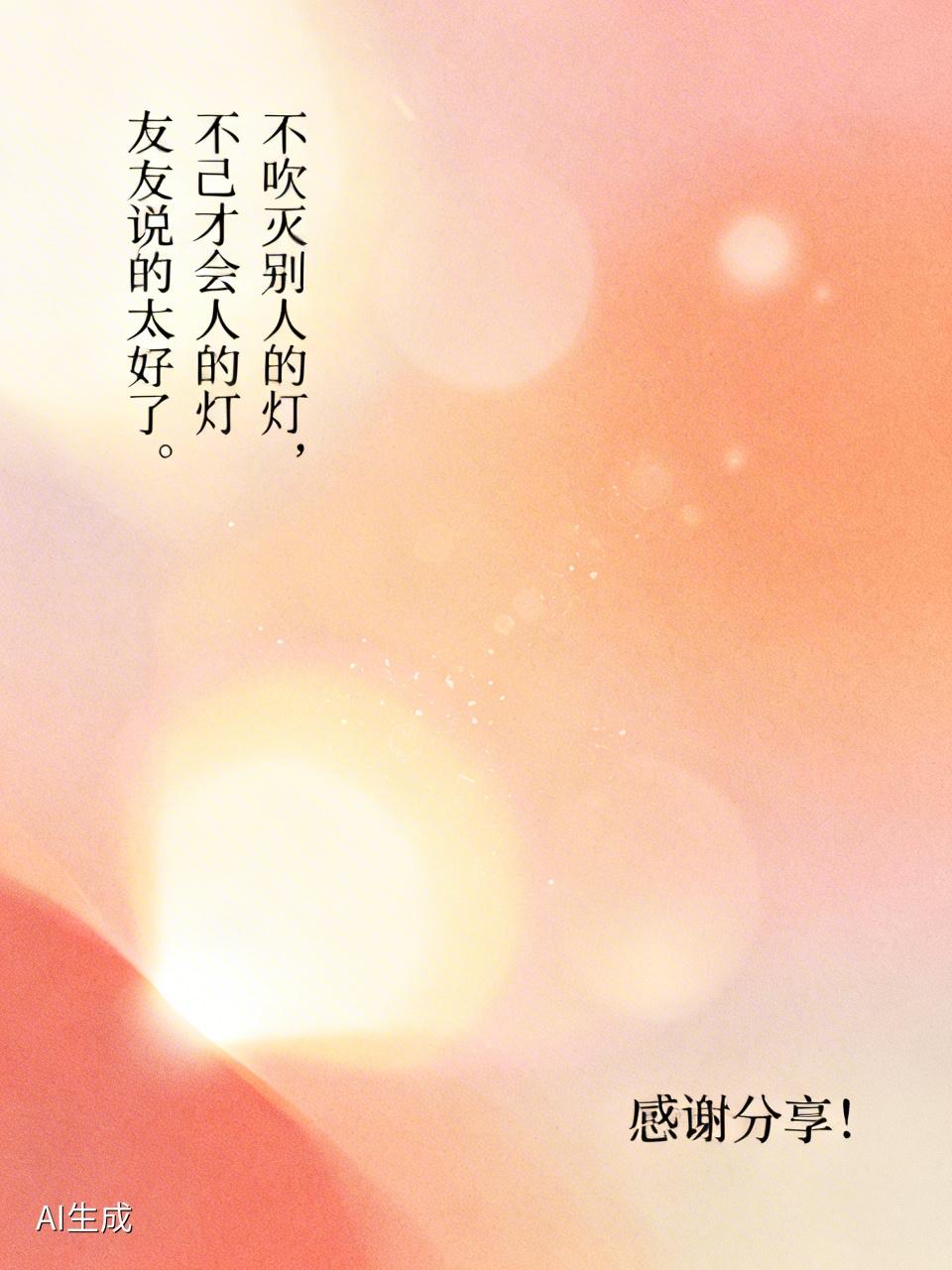 友友说的太好了。 不吹灭别人的灯 自己才会光芒万丈。 感谢分享![赞][给力][给力]莫和别人去诉说 低谷里总有光 平凡人也有光 灵魂有光的人 照耀心灵的光芒 独绽自身光