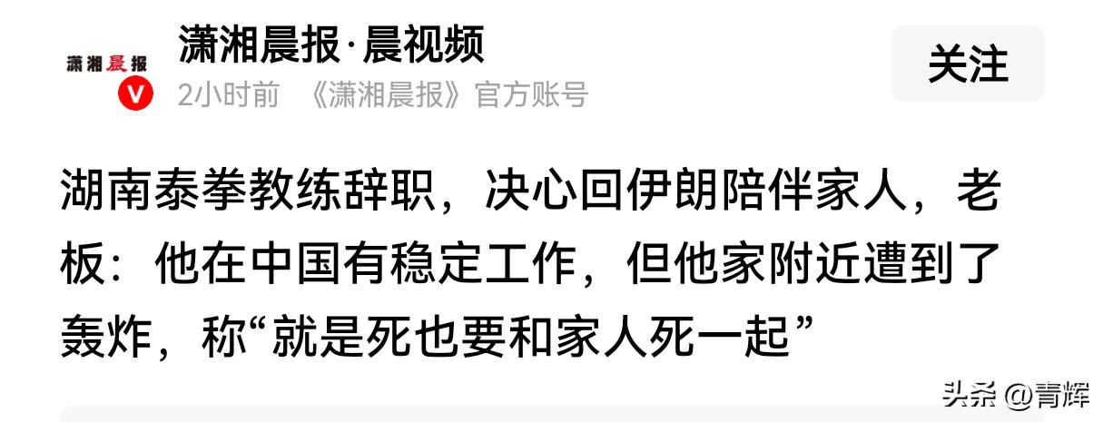 伊朗泰拳教练毅然回国:死也要和家人死在一起 在湘西有一位从德黑兰来的泰拳教练,名叫赛义德。2024年的时候来到我国,除了打比赛之外,还负责少儿培训。工作期间,他把绝大多数的工资收入都邮回家里,自己只保留数百元的生活费。可以说这几年这位拳击教练在中国发展的还是挺不错的。直到上个月28号伊朗爆发战争,拳击教练了解到自己的家附近已经遭到了轰炸,万幸家人没有受伤。从那一刻起,这位拳击教练就下定决心要回国。虽然在中国是和平的工作是稳定的,但是现在他最放心不下的还是家人,虽然自己的家乡正面临战争威胁,但哪怕是死也要和家人死在一起。 临行时这位伊朗拳击教练说,如果战争结束,自己和家人都平安的话,自己还会回到中国来。 其实人类的很多感情都是相通的,不分人种和地域,尤其是对家人的感情。我们无法理解这位伊朗教练现在的复杂心情,就像那些身处战乱国家中的人,无法想象身在和平的环境里到底是怎么样一样!
