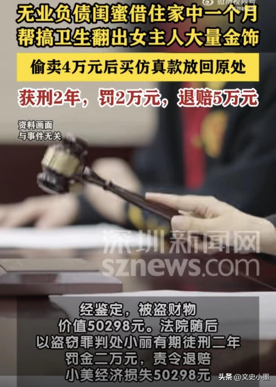 福建一女子好心收留闺蜜在家借宿,结果却引狼入室,被闺蜜偷走大量黄金首饰! 她的闺蜜在借宿期间,帮忙打扫卫生时意外发现,在卧室衣柜的抽屉里放着很多黄金首饰,有黄金戒指,黄金耳环,黄金手链等! 闺蜜看到这些黄金首饰时,想到自己不仅没有工作还欠了一屁股债,心生歹念,决定把这些黄金首饰偷走卖掉还债! 为了不让女子发现自己的偷盗行为,她这位闺蜜购买了一些款式类似的假黄金首饰冒充真的!凭借这招偷梁换柱,她在借住期间一共偷拿了三次,最终卖掉得了4万元! 假的真不了,有一天女子发现自己的黄金首饰有点不对劲,感觉跟之前的不太一样,最终发现了闺蜜的盗窃行为! 真是应了那句话,害人之心不可有,防人之心不可无,自己明明好心收留闺蜜,却被闺蜜辜负,伤害了感情! 最终,她这位好闺蜜被判了两年,同时还要赔偿给她5万多元经济损失!通过这件事女子应该提高防范意识,妥善保管好自己的贵重物品,财不外露!