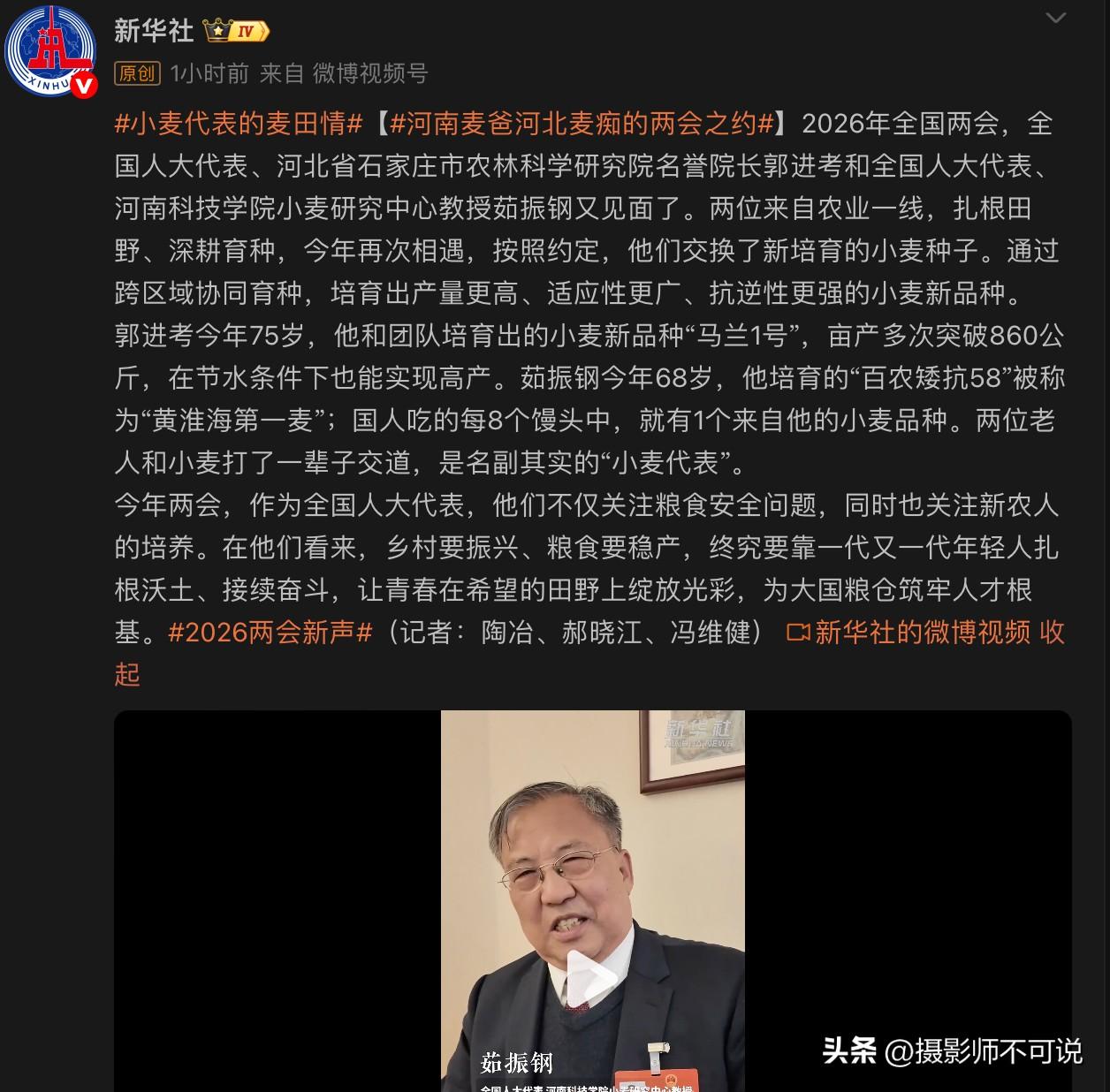 这两天被这三位可爱的老科学家给刷屏了,没想到他们都那么高龄了干劲儿还那么足!这三位老科学家是小麦育种和种植领域的专家,他们在两会空隙间在瑞雪纷纷里交换了各自的种子,以期待跨区域杂交获得更优质的小麦品种。尤其是茹老爷子谈起他们的事业简直是眉飞色舞恍如同学少年般的挥斥方遒,他说“我们一起干它一把,从来就没人干的事,这多有意思啊”,老铁们这有没有种高山流水的浪漫感?他还说人都会死,但总应该做点儿什么贡献,这是世界观问题,然后还赋诗一首,太让人热血沸腾了,简直恨不得我自己能够有这个能力和机会和他们一起干它一票!要不怎么说男人至死都是少年呢?看了他们的事迹,我都觉得自己还很年轻了,激情瞬间又回来了!