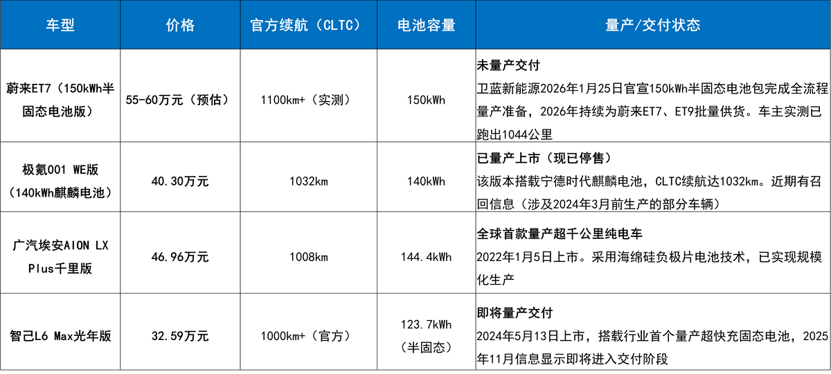 上述4款车型的共同点是:均采用了大容量电池包(140‑150kWh)与半固态/固态电池技术,能量密度显著提升。但考虑成本和量产难度,价格普遍不低,最便宜的智己L6 Max光年版要32.59万元,最高的蔚来ET7预计要60万。并且从市场热度看,有些“雷声大雨点小”。比如,当蔚来ET7长途试驾直播以及智己L6Max光年版的上市均引发不少关注和热议,但最后均未能有效将热度转化为订单或销量。