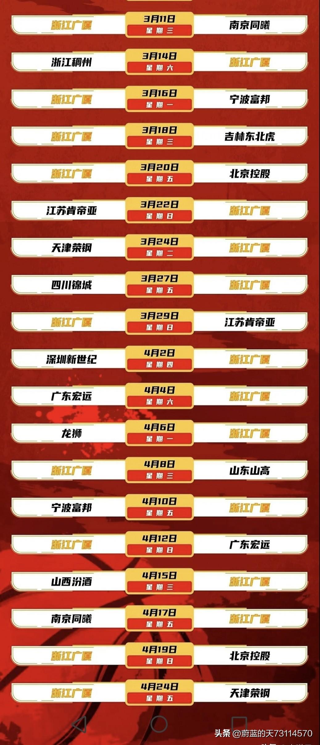[玫瑰]CBA常规赛42轮,已战罢23轮,浙江方兴渡(广厦)战绩为19胜4负,主场保持不败,积42分,暂排20队积分榜第一。 在3月11日及以后的19场比赛,浙江方兴渡将分别对阵的队是: 主场对南京天之蓝,客场对浙江稠州金租,主场对宁波町渥、吉林长白山恩都里、北京北控,客场对江苏肯帝亚、天津先行者、四川丰谷酒业,主场对江苏肯帝亚,客场对深圳马可波罗、广东东阳光、广州朗肽海本,主场对阵山东高速,客场对宁波町渥,主场对广东东阳光,客场对山西汾酒股份、南京天之蓝,主场对阵北京北控和天津先行者。 这其中:主场9场,客场10场。估计浙江方兴渡可拿下16场比赛。而对广东东阳光的2场, 对山东高速,对山西汾酒股份和对阵浙江稠州金租的德比之战,最引球迷关注。 个人预测:本赛季的常规赛和季后赛冠军将在浙江方兴渡与上海久事两队中产生。 [玫瑰][玫瑰]附浙江方兴渡(广厦)常规赛后19场比赛赛程(见截图三)。 浙江广厦