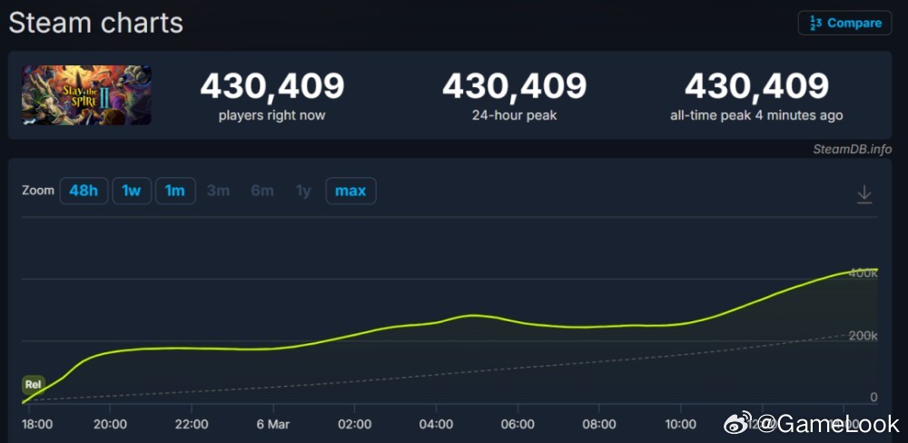 【首日43万在线,《杀戮尖塔2》把Steam服务器干崩了!网页链接】事实上《杀戮尖塔2》用实打实的内容接住了玩家们的热情。从凌晨开始,SteamDB的在线人数曲线几乎垂直拔高,好评率也随着首批玩家的通关结算迅速稳固在“好评如潮”的高位,截止发稿,游戏的Steam同时在线人数已超43万人。