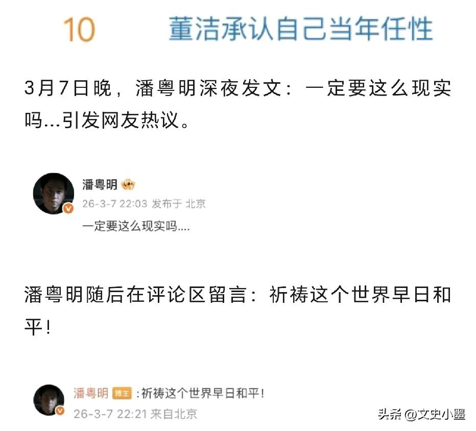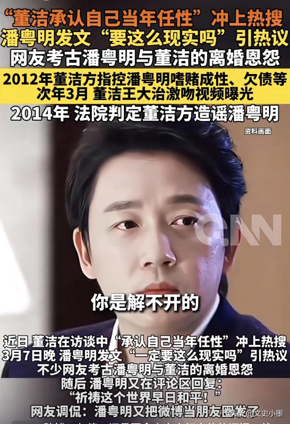 董洁2012年离婚前,在没有掌握实质性证据的情况下,公开指控潘粤明存在嗜赌成性,欠债等情况,让潘粤明事业陷入停滞! 之后,在2013年,董洁与王大治的亲密视频被曝光,时间点证明她是在婚内出轨王大治的,舆论开始出现反转,董洁口碑急剧下滑,事业受到很大影响! 她与潘粤明离婚后,争取到了儿子顶顶的抚养权后,曾长期不让潘粤明与儿子接触见面,潘粤明曾经去幼儿园门口等孩子,结果幼儿园不让亲属名单外的人见孩子,潘粤明曾多次跑空。哪怕是潘粤明父亲重病,董洁也不让孙子见爷爷 潘粤明无奈只能在儿子生日时隔空送上祝福,但他并没有因此公开指责董洁这一行为,为两人保留了基本的体面! 现在董洁后悔了,在一档访谈中首次承认当年是自己太过任性和不成熟,并表示以后不会再阻止前夫潘粤明与儿子见面了。按理说,事情已经向着好的方向发展,但那条2023年潘粤明为儿子庆生的动态互动也搜索不到了,难免让人生疑其做法! 可能老潘看到了董洁的动态,才发了那条让人捉摸不透的微博:一定要这么不体面吗?一定要这么现实吗? 现在,他们的儿子顶顶已经16岁了,在他俩离婚时才两三岁,这几年一直是由董洁抚养长大,潘粤明已经错过了儿子成长的关键时期,在一个缺失父爱的环境中长大,对孩子童年来说是不完整的! 离婚风波已经过去这么多年了,受伤害最大的是孩子,本该为了孩子体面相处,现在整这出实在让人捉摸不透!