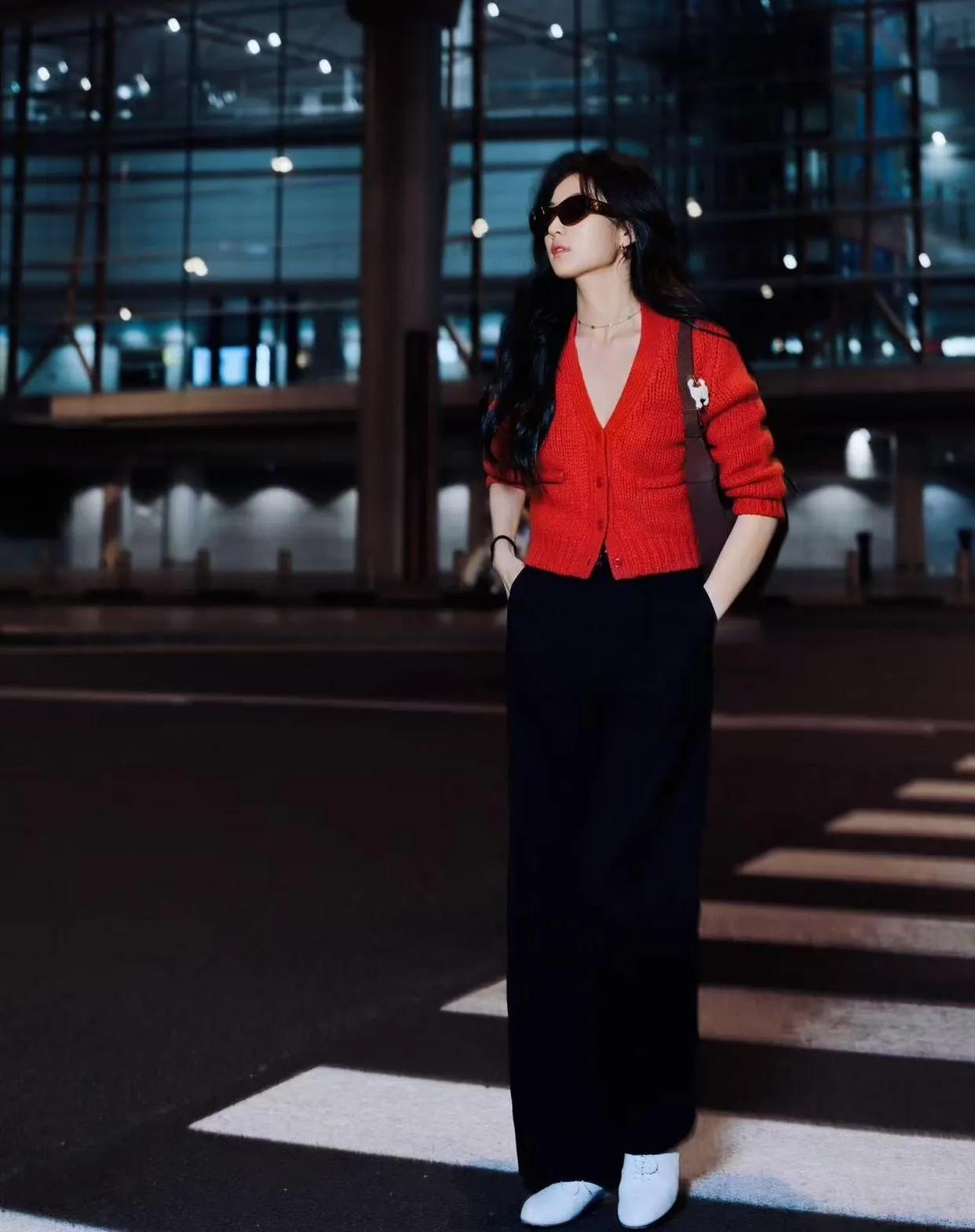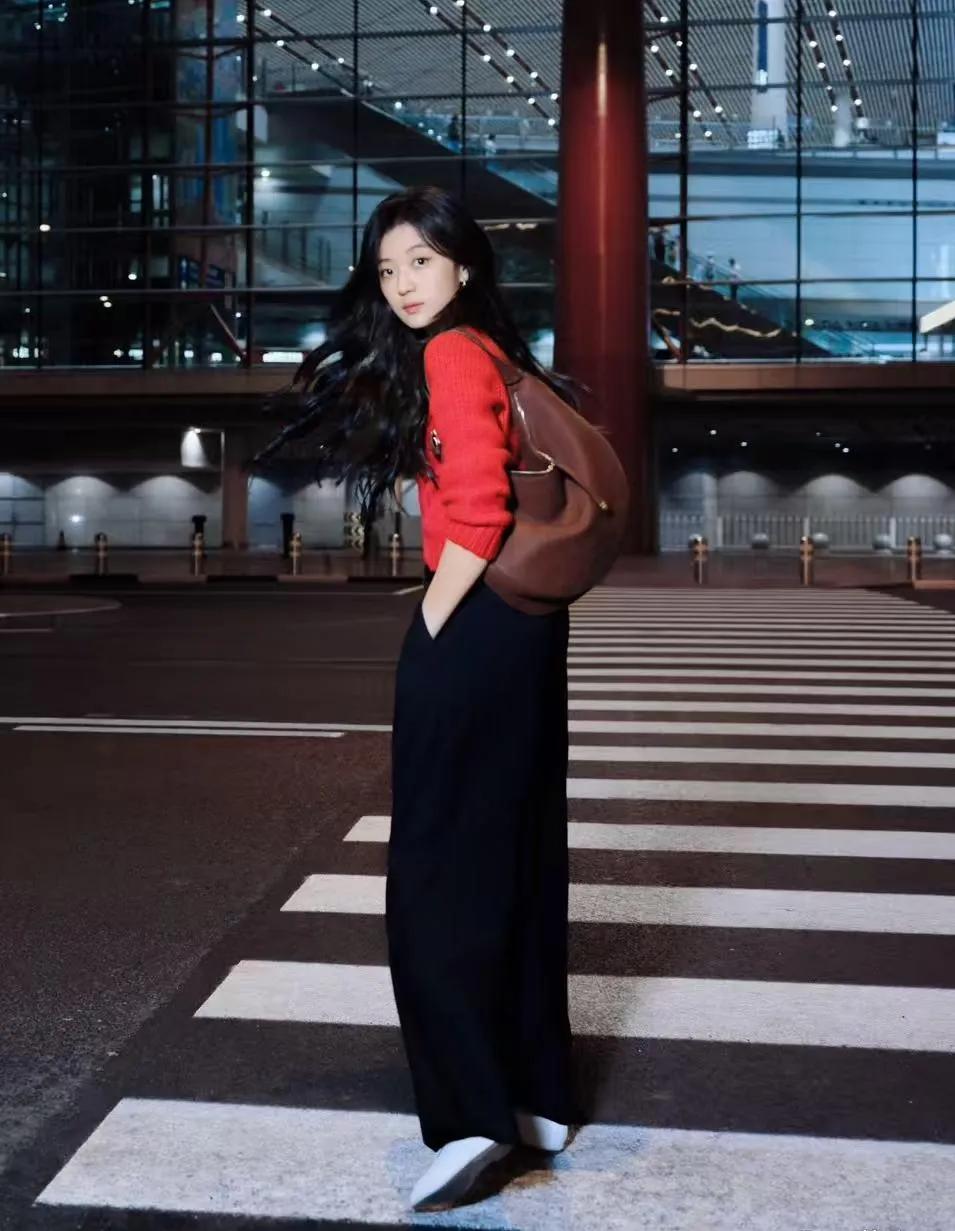 千机场私服太会穿了!红黑配色又飒又吸睛✨ 孙千这身机场look太有氛围感了! 红色短款针织开衫+黑色阔腿裤,经典红黑配色,利落又显气场。 短款上衣拉高腰线,阔腿裤藏肉显瘦,再配上棕色背包和小白鞋,随性又时髦,完全是行走的穿搭模板。 孙千穿搭 机场私服 红黑配色 阔腿裤穿搭