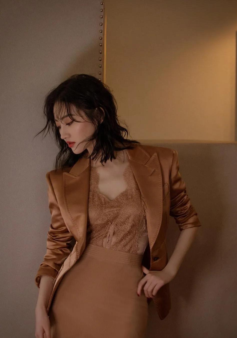 景甜这一身,把温柔和飒爽拿捏了✨ 景甜一身同色系穿搭太绝了!香槟金缎面西装外套,内搭同色蕾丝吊带,下配不规则半裙,再踩上细高跟,整套look温柔又不失气场。 湿发造型搭配红唇,在暖调光影下更显女人味,甜而不腻,美到犯规。 景甜穿搭 同色系高级感 女明星造型
