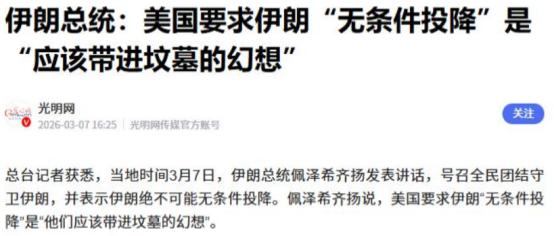 特朗普勒令伊投降!不到24小时,伊总统:美国“带进坟墓的幻想” 3月6日,美国总统特朗普突然对伊朗下达毫无转圜余地的终极通牒,彻底关闭美伊谈判的所有通道,明确要求伊朗必须无条件投降,除此之外没有第二条路可走。 特朗普这番话不是随口说说,他当天还在社交媒体上补了一句,伊朗只有投降,才能选出美国认可的领导人,美国及其盟友才会帮伊朗重建经济。 熟悉美伊关系的人都清楚,这已经不是特朗普第一次对伊朗放狠话。早在2026年初,伊朗爆发大规模示威游行时,特朗普就公开威胁要干涉伊朗内政,甚至一度考虑对伊朗发动军事打击。 特朗普这次直接逼伊朗无条件投降,背后藏着他的无奈。自2月28日美国和以色列联手对伊朗发动大规模空袭后,伊朗革命卫队展现出极强的韧性,哪怕损失不少高层,依旧能持续对美以发动反击。 特朗普之前还放话要在四周内解决伊朗问题,现在看来这个目标根本实现不了。战事拖得越久,对美国越不利。霍尔木兹海峡被封锁后,国际油价已经涨了近30%,美国国内油价也跟着涨了11%,美国民众的不满情绪正在上升。 他急着逼伊朗投降,还有个目的是试探盟友的态度。目前公开支持美国军事行动的,只有波兰、捷克等少数东欧国家,英、法、德这些欧洲大国都明确表示不愿参与。 海湾国家更是态度中立,阿联酋之前虽透露要冻结伊朗海外资金,可伊朗很快就释放善意,这让美国想拉盟友分摊战争成本的计划落了空。特朗普把话说绝,就是想看看这些盟友到底站不站自己这边。 更关键的是,特朗普此举也是为了稳住自己的基本盘。他的支持者大多是MAGA派,这类群体很吃“强硬外交”那一套,对伊朗放狠话、逼伊朗投降,能让他在支持者面前刷足存在感。 特朗普的通牒刚发出去,不到24小时,伊朗总统佩泽希齐扬就给出了强硬回应。佩泽希齐扬直接表态,美国要求伊朗无条件投降,就是他们应该带进坟墓的幻想。 佩泽希齐扬的回应不是硬撑,伊朗确实有底气说这句话。伊朗有着三千多年的文明史,从来没有向外来势力低头的传统,更何况美国只是一个有两百多年历史的国家,根本没资格对伊朗指手画脚。 与此同时,佩泽希齐扬还向伊朗周边邻国道歉,承诺只要邻国不主动攻击伊朗,伊朗就不会再攻击邻国,也不会发射导弹。 很多人看不懂伊朗这波操作,其实这是非常聪明的一步。之前伊朗打击美军资产时,不小心损坏了邻国民用设施,给了美国拉拢盟友的借口。现在主动道歉、承诺停火,能安抚邻国的恐慌情绪,切断美国拉拢盟友的链条。 伊朗这么做,也是在争夺话语权。它想让全世界看到,伊朗不是好战分子,真正破坏中东和平的是美国这个域外霸权。 还要说清楚,伊朗拒绝投降,不代表它想把战争打到底。伊朗国内也有现实压力,石油出口是伊朗财政的重要来源,战事持续下去,石油贸易会受到严重影响,国家财政和伊朗革命卫队的利益都会受损。 特朗普可能以为,凭借美国的军事优势,就能逼伊朗屈服。他忘了,伊朗革命卫队已经化整为零,深谙游击战术,美军要是盲目投入地面部队,只会徒增伤亡。 目前美军在中东已经部署了两艘航母,还有近三百架先进战机,相当于一个以色列空天军的规模,可依旧没能打垮伊朗。 更值得注意的是,特朗普要求伊朗无条件投降,这种做法在当今世界非常罕见,上次还是二战期间罗斯福对纳粹的态度。这充分暴露了美国的单边霸权主义,也给全球治理带来了风险。 如果美国一直拒绝谈判,没有国家能进行有效调停,全球多边治理体系会受到严重冲击。而且战事持续下去,国际油价可能突破120美元,全球经济都会跟着受影响。 现在的局势很明显,特朗普的强硬通牒,不仅没能逼垮伊朗,反而让伊朗在外交上占据了主动。伊朗一边硬刚美国,一边安抚邻国,正在慢慢构筑自己的外交防火墙。 后续局势怎么走,关键看美国和伊朗的博弈,还有周边国家的选择。但可以肯定的是,伊朗绝不会接受无条件投降,特朗普的幻想,终究只会是幻想。