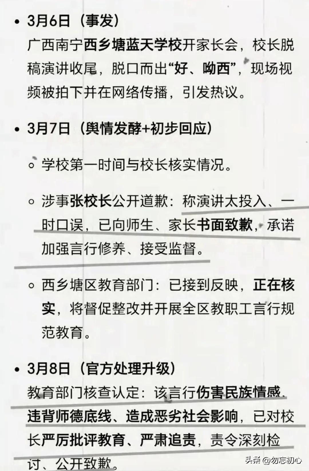 一句“哟西”,震惊网络。 这是广西南宁某校校长开家长会的结束语。 我们都知道“哟西”是哪国话,代表的是什么意思。 虽然校长在事后承认了错误,道了歉,称自己是“口误”,但绝不能原谅。我们送孩子去学校是学知识,具有爱国情怀,民族气节。校长的一句“哟西”,让我们回到了炮火连天的时代。这哪里是口误,这是习惯。就算是开玩笑,也不是他这种身份的人可以说的。