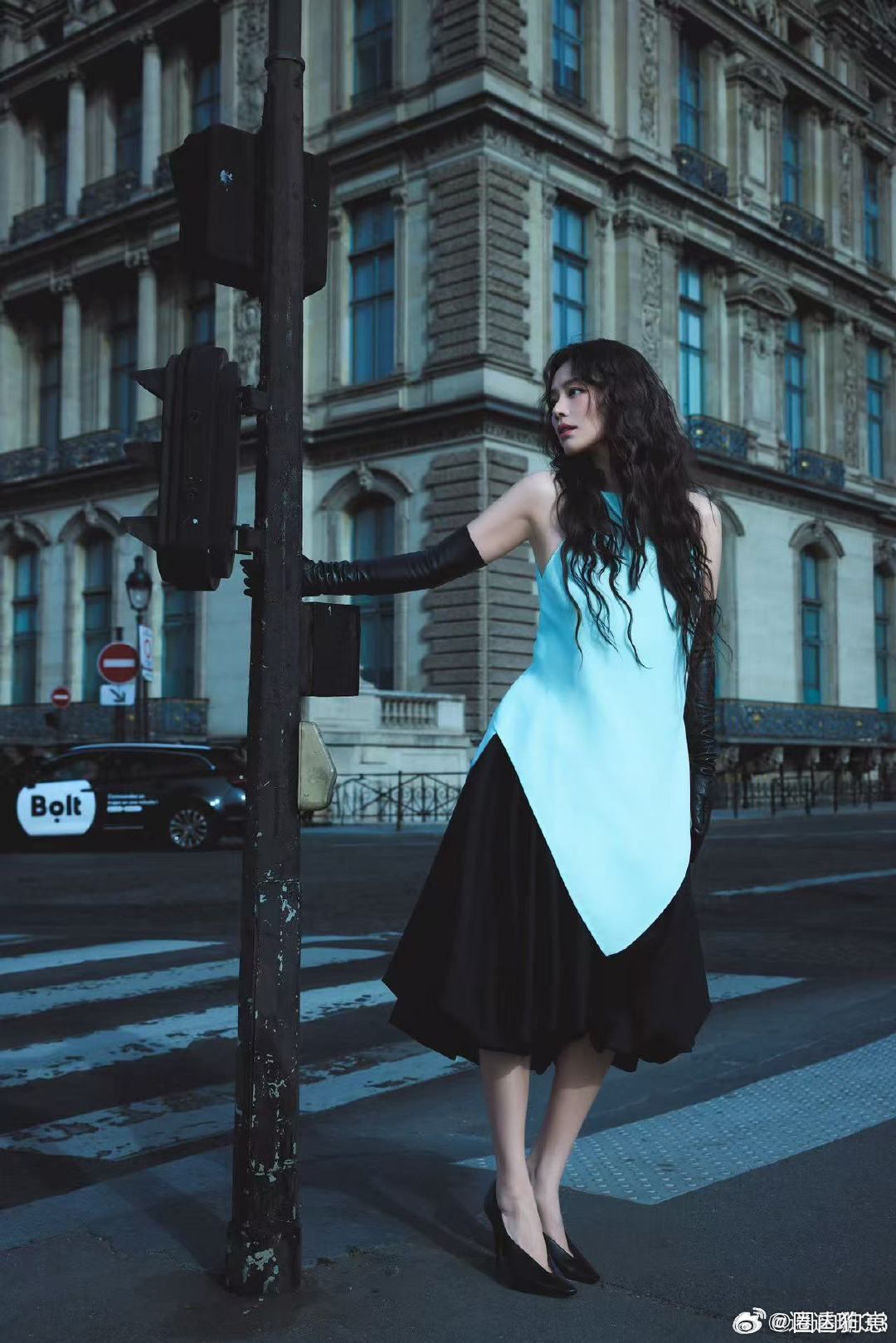 马思纯把撞色玩明白了细节把控得特别好,蓝绿黑三种颜色搭配和谐又亮眼,冷色调增添酷