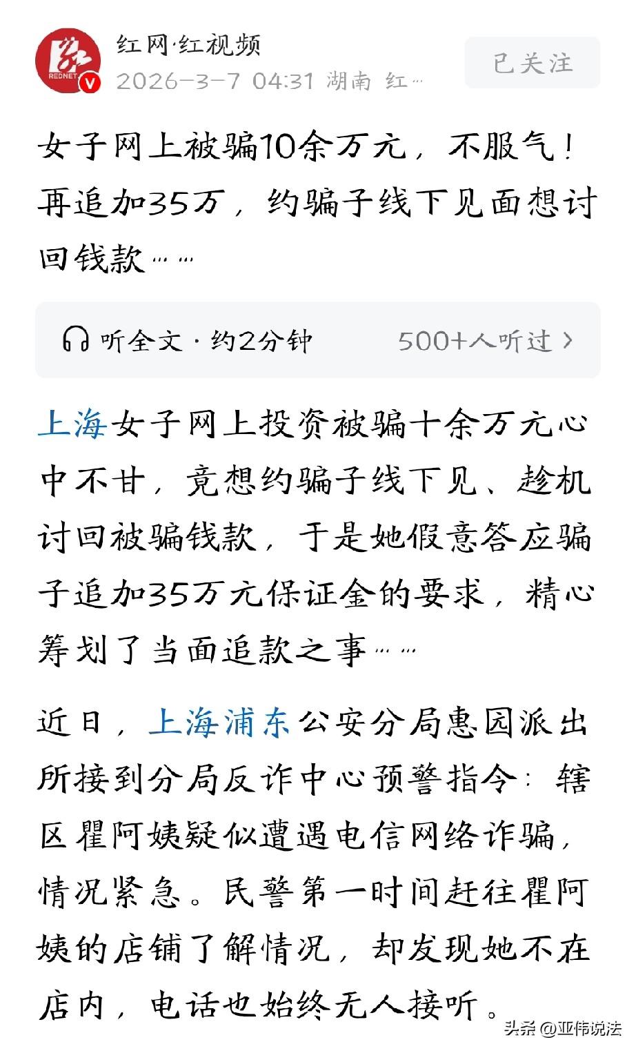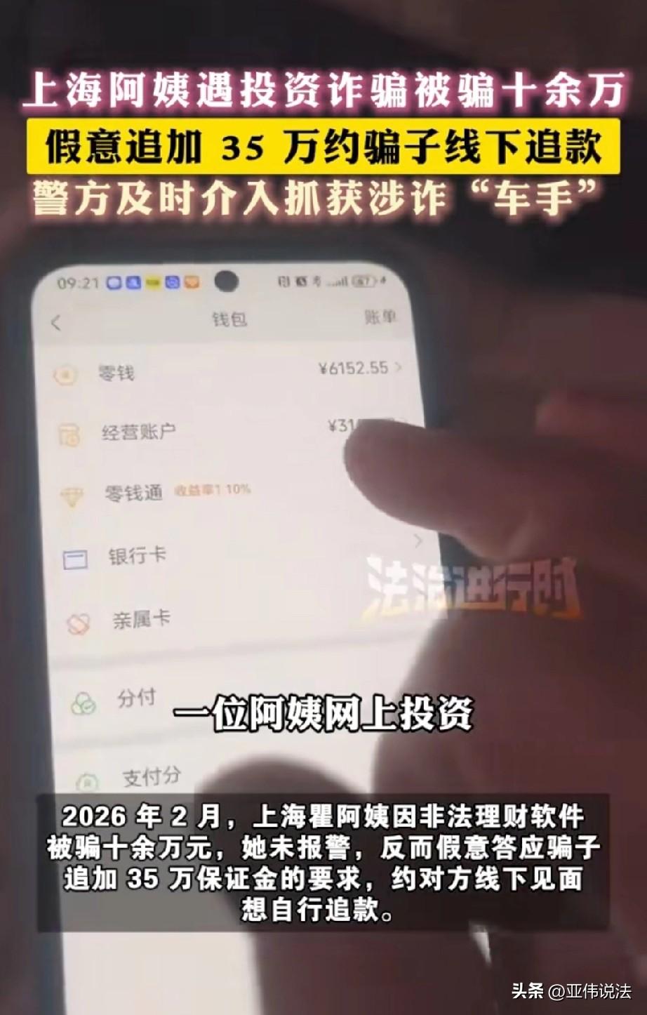 电视都不敢这么演!上海,大妈在网上投资了十几万,本想着大赚一笔,谁知却被骗了个精光。她不甘心,竟然想着约骗子线下见面,想办法把被骗的钱追回来。所以,她将计就计,假装答应骗子,说想要追加35万保证金,并和对方约好了见面地点。万万没想到,见面后的情况,跟她想象中完全不一样。 瞿阿姨开了家店,生意不错,手头也攒了些积蓄,日子过得很滋润。 今年2月份,她被人拉进了一个投资理财群,看着群里天天有人晒盈利截图,说什么“金牌导师带单”“稳赚不赔”,她心动了。 一开始她投了点小钱,还真赚了,也能提现,这下她放了心,前前后后投进去十多万。 结果没过几天,账户登不上了,群也解散了,那个天天嘘寒问暖的“客服”也联系不上了,瞿阿姨这才反应过来,自己被骗了。 十多万呀,那可不是大风刮来的,是她和老头子攒的辛苦钱,她越想越气,气得晚上觉都睡不着。 换作旁人,这时候就该报警了,可瞿阿姨心里憋着一股劲儿,不能就这么自认倒霉,非得把钱追回来不可。 她翻来覆去地想,突然冒出一个念头:骗子不是还在让我追加保证金吗,那我就将计就计,把人约出来见面,当面把钱要回来。 瞿阿姨打定主意,主动联系上那个“客服”,说自己想通了,愿意再交35万保证金,但必须线下交易,当面把钱给他们。 那头沉默了一会儿,居然答应了,约好第二天下午在某路口碰头。 瞿阿姨心里有几分得意,这回看你们往哪儿跑。她跟老头子商量好了,两个人一起去,到时候见机行事,一定要把钱要回来。 她不知道的是,这时候当地派出所的反诈预警系统已经响了,系统显示,辖区一个姓瞿的阿姨可能正在遭遇诈骗。 民警火速赶到她店里,人不在,打电话,也一直没人接。 民警觉得不对劲,马上联系她家属,这才知道,瞿阿姨已经先他们一步,去见骗子了。 派出所赶紧调人往约定地点赶。 当天下午两点多,瞿阿姨和丈夫如约到了路口,她四下打量,等着对方出现。不一会儿,一个男人走了过来,接头暗号对上了。 但瞿阿姨一看这人,明显不对劲,对方眼神飘忽不定,语言表达也磕磕绊绊,压根儿不像是电话里那个说话油滑的“金牌导师”。 这人就是曹某,一个专门替诈骗团伙跑腿取钱的“车手”。 他一看瞿阿姨两手空空,没带现金,脸就变了,转身就要叫车跑。 就在这时,蹲守的民警及时赶到,曹某还没反应过来就被摁住了。 后来曹某交代,他就是个跑腿的,上家让他来取钱,给多少跑腿费都不知道,至于骗瞿阿姨的那些人到底是谁、在哪儿,他根本说不清楚。 事后,民警当场对瞿阿姨做了普法教育,这些骗子可没有想象中那么简单,他们不是单打独斗,而是一个犯罪团伙。 他们分工明确,骗你钱的和出来取钱的根本不是一拨人,你约出来见的永远是这些跑腿的,真要出点什么事,人家跑了你追都追不上。 瞿阿姨站在那儿,半天没说话。 她本来觉得自己挺聪明,能把骗子“将计就计”,结果要不是民警来得快,这35万要是真带来了,又是打水漂,搞不好人还有危险。 《刑法》第二百六十六条规定:诈骗公私财物,数额较大的,处三年以下有期徒刑、拘役或者管制,并处或者单处罚金;数额巨大或者有其他严重情节的,处三年以上十年以下有期徒刑,并处罚金。 诈骗团伙以投资理财、稳赚不赔为诱饵,虚构盈利与导师带单,骗取瞿阿姨十余万元,已构成网络诈骗且数额巨大,依法应从严惩处。 跑腿“车手”曹某为诈骗提供取现帮助,可视情以共犯或帮助信息网络犯罪活动罪追责,目前已被刑事拘留。 瞿阿姨自行约见骗子的私力救济存在人身与财产二次受损风险,不符合法定维权路径。 遭遇诈骗,千万不要逞能,应第一时间报警,由公安机关侦查追赃、固定证据,这才是最安全有效的维权方式。