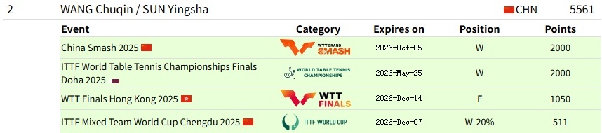 女单世排第一男单世排第一混双世排第二