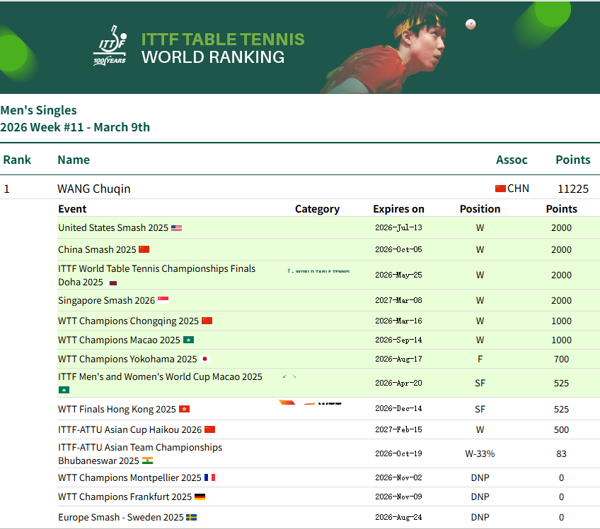 孙颖莎王楚钦莎头 20260309|2026年第11周世界排名更新女单世排第一男