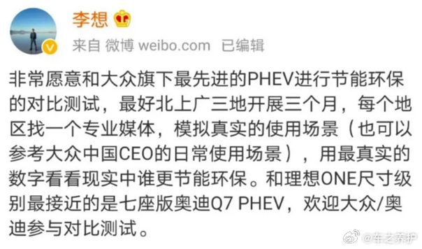理想没有选择沉默。李想当即在微博喊话,邀请大众旗下最先进的PHEV车型与理想ONE做真实场景节能对比测试。大众全程冷处理,未予回应。