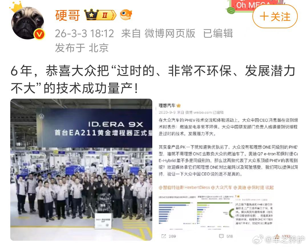 但真正的胜负从来不在一句反讽里。大众EA211增程器的技术底子摆在那里,ID.ERA 9X的实测数据也不差。传统巨头的转身虽然慢,但转身之后的发力可能更猛。