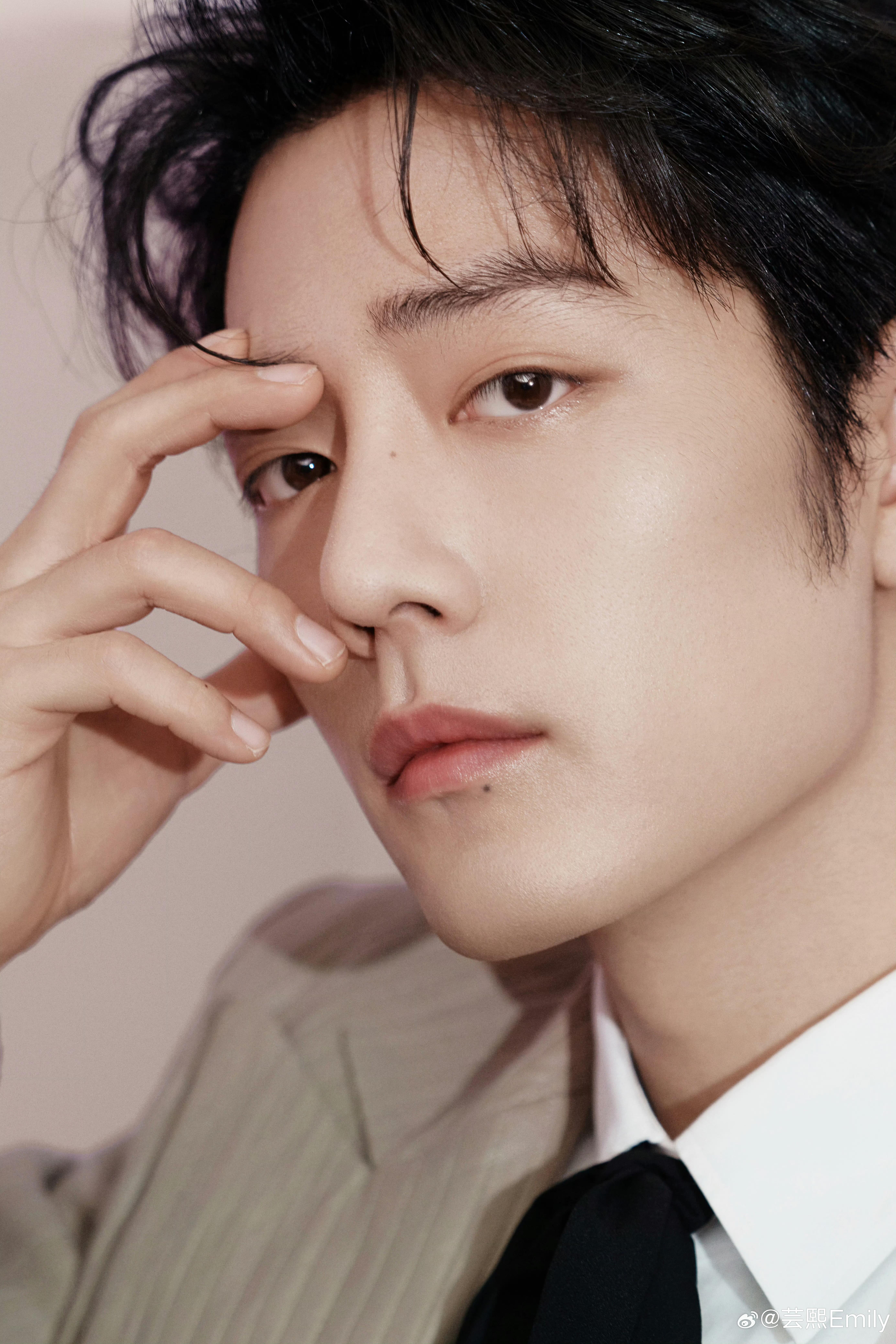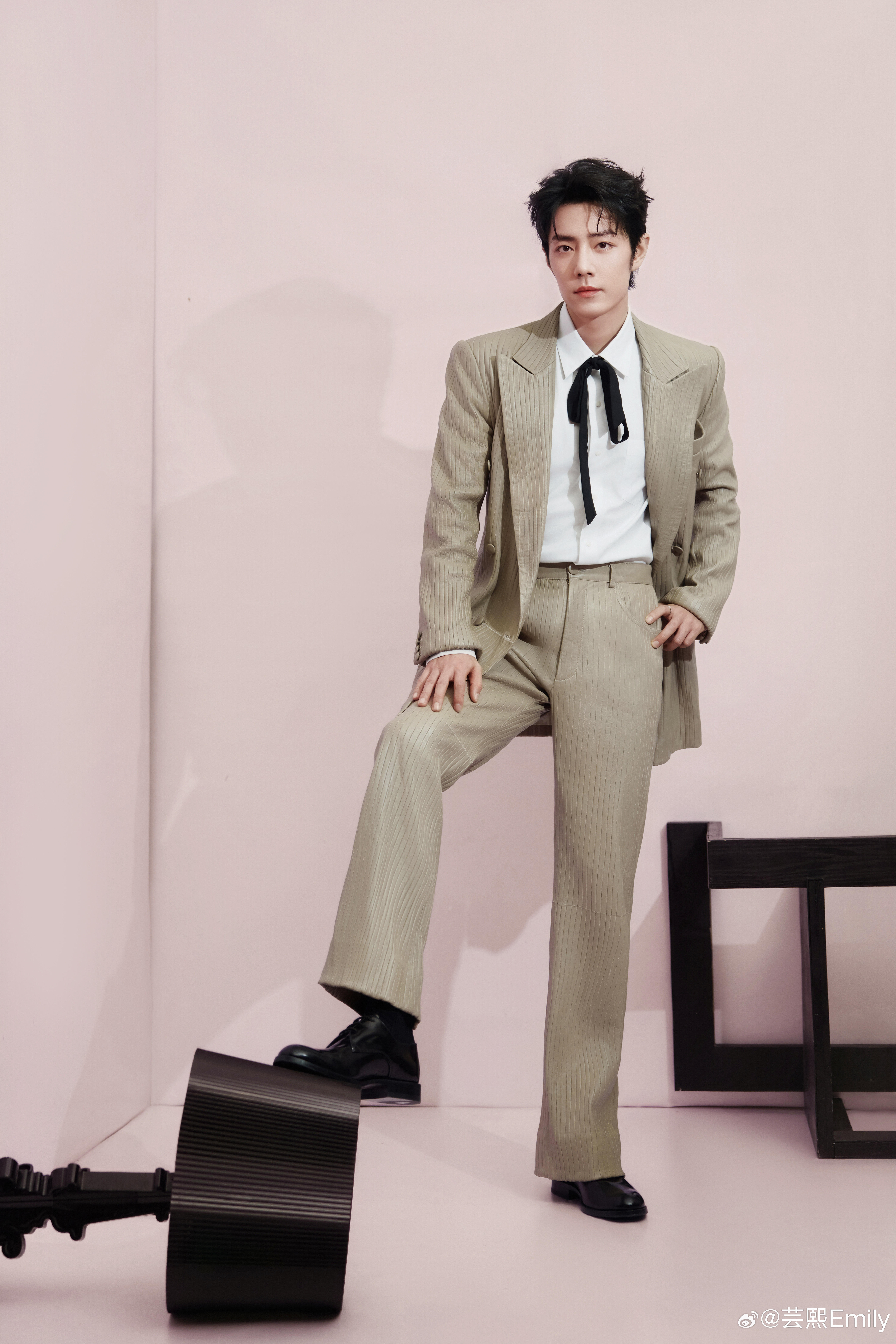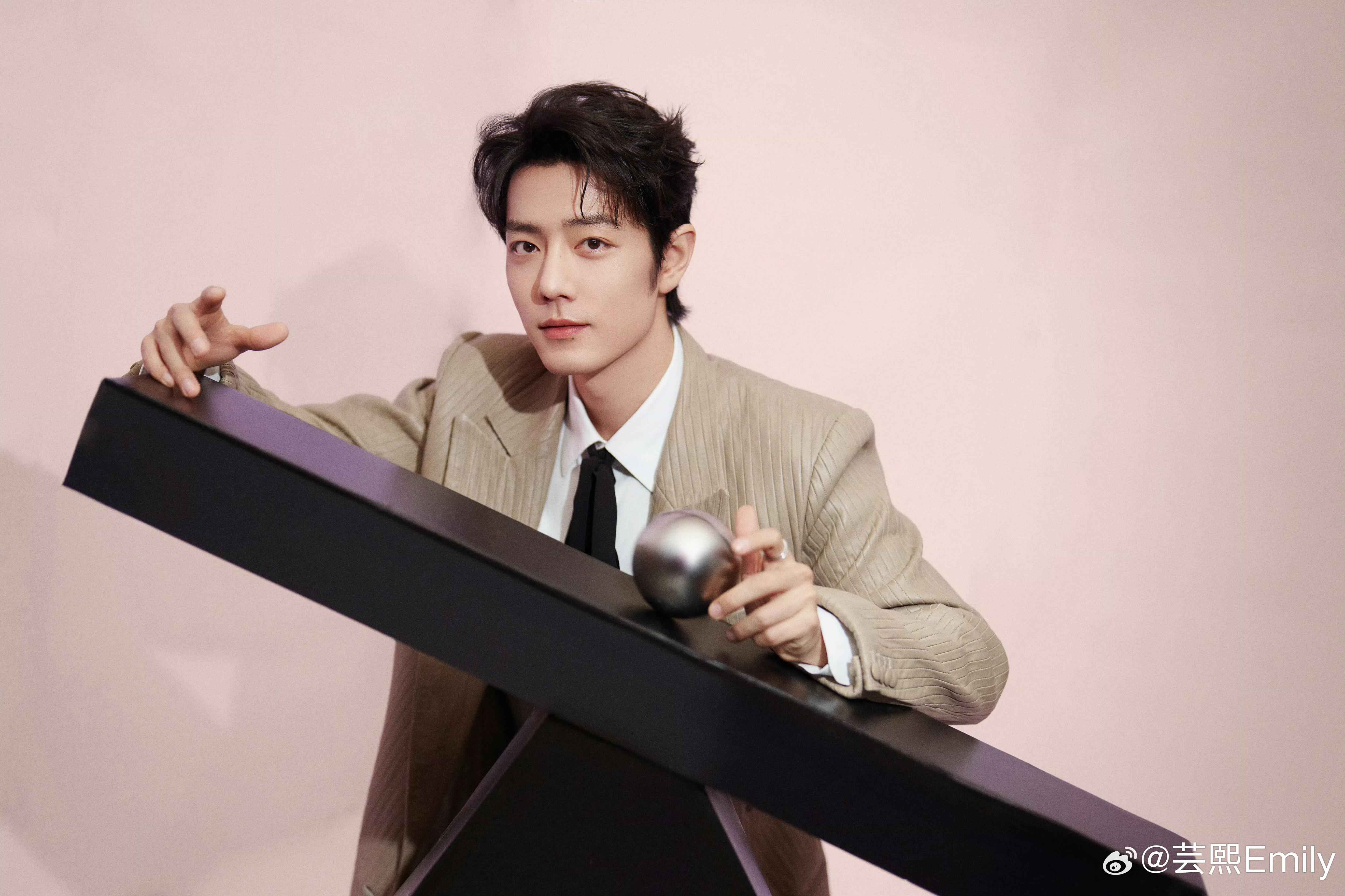 肖战亮相电视剧品质盛典造型,身着浅卡其色条纹西装套装,内搭白衬衫与黑色飘带领结,
