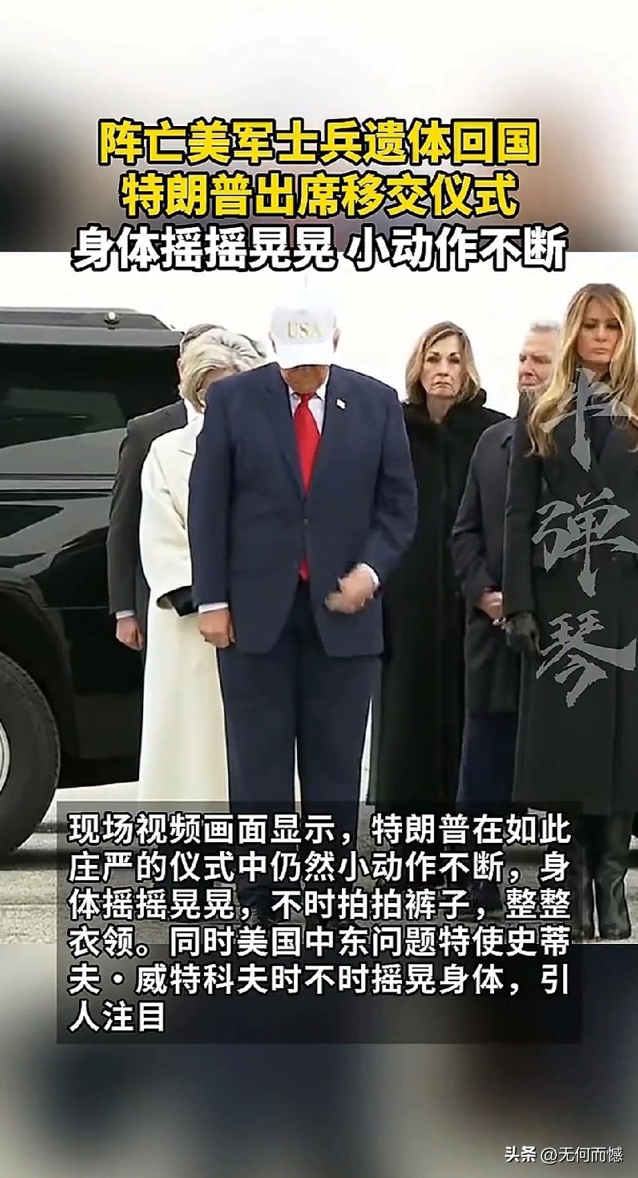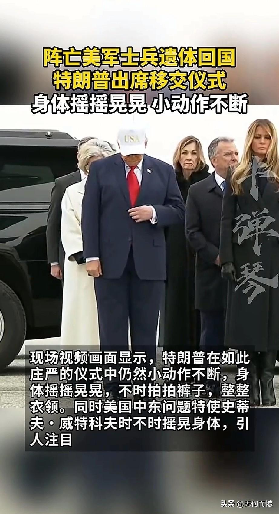老特在出席阵亡美军士兵遗体回国的交接仪式上,表现的不够严肃,不够庄严,在参加仪式的过程中,他的身体摇摇晃晃,有时候甚至是前仰后合,各种小动作也是不断,一会儿拍拍裤子,一会儿用手整理整理衣领,感觉没有个稳当劲,老话说的好,老要张狂少要稳,他是不是知道这句话的含义?