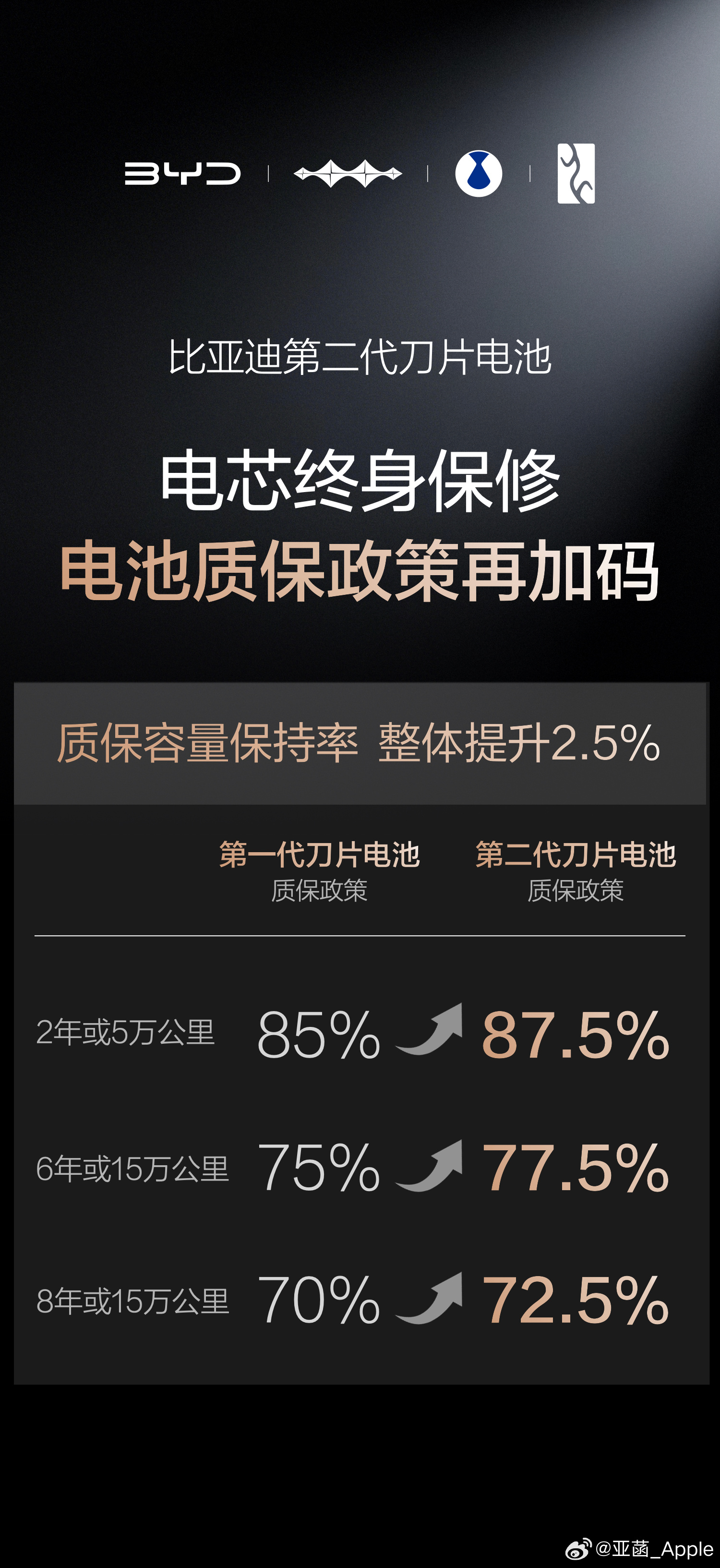 质保政策再加码更显底气,电池容量保持率提升2.5%,低于77.5%免费包换,电芯终身保修。从电池大王到技术标杆,比亚迪第二代刀片电池以安全、长寿命的硬核实力,重新定义全球动力电池新标准菡你来看车汽场全开大v聊车