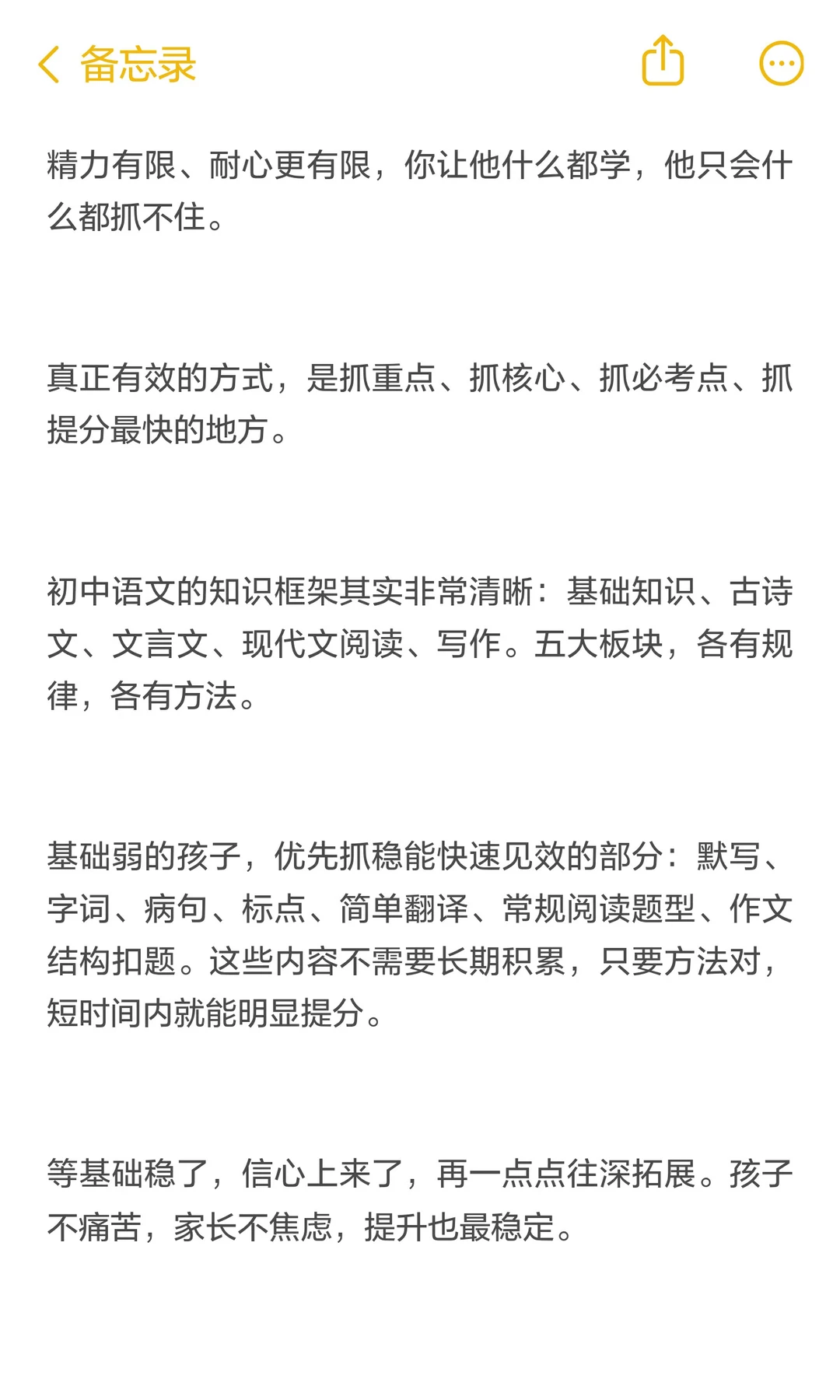 初中语文学习需精准方法,基础薄弱的孩子更需路径指导。通过模块化、有序化教学,先抓稳送分题,再突破中档题,最后攻克难题。方法对了,孩子能快速提升,家长也能减少焦虑。