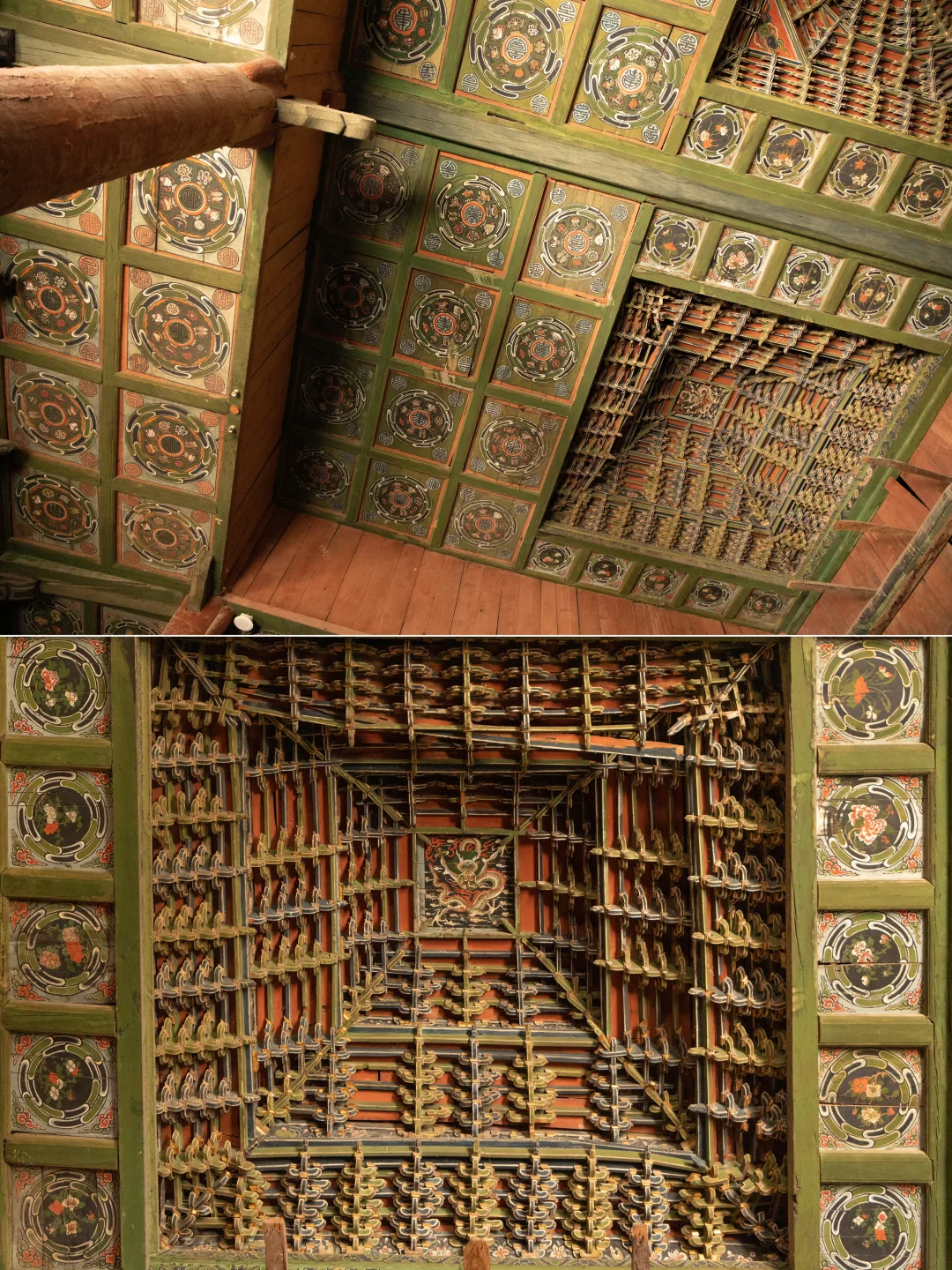 ▪️殿内现存明代金漆斗拱藻井、覆斗形天花、佛家八宝与篆书寿字彩绘,工艺精湛,美轮美奂。