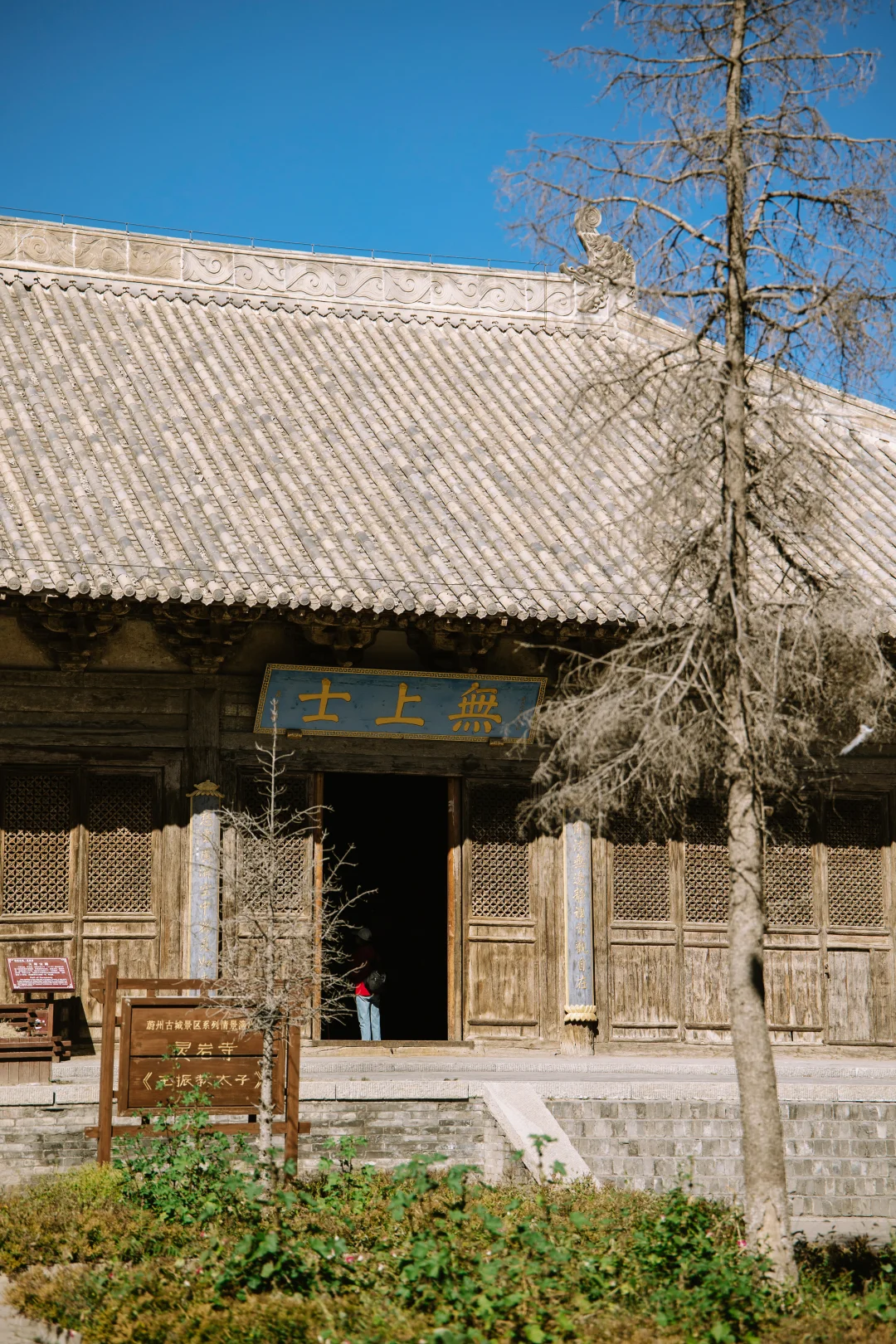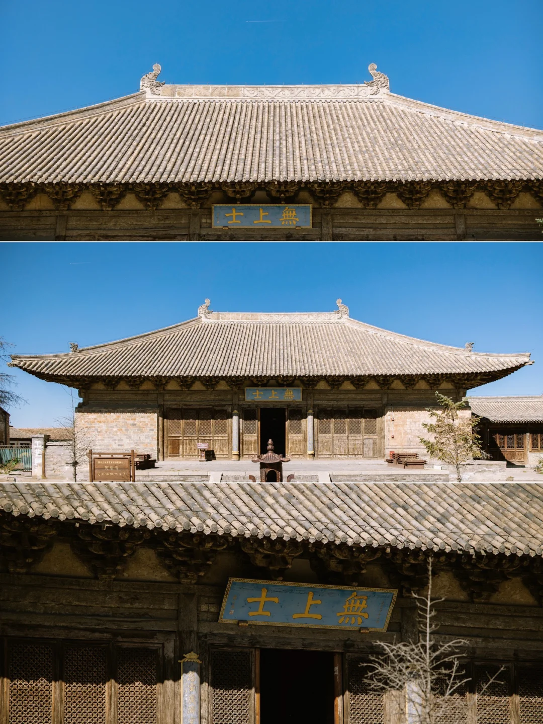 ▪️大殿匾额上写“无上士”,为佛教术语,是佛陀(释迦牟尼)的十大称号之一,意为佛陀的智慧与德行至高无上。门前一幅对联,上联:佛法无边静里常观自在,下联:慈云广济空中密见如来。