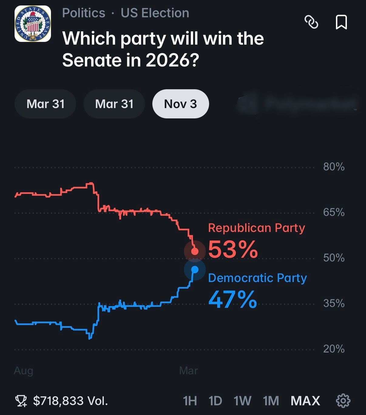 民主党在中期选举中赢得参议院的概率飙升至 47%,赢得众议院的概率达到 85%,均创下新高。
