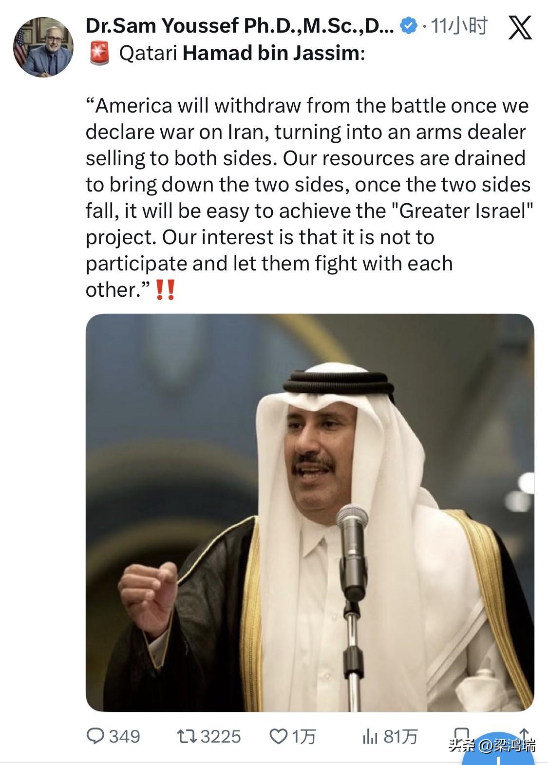 卡塔尔前总理哈马德·本·贾西姆是个明白人,他分析的对: “只要我们(海湾国家)对伊朗宣战,美国立马就会撤出战斗,转身变成军火贩子,同时向双方卖武器。 我们(海湾)的资源会被耗光,用来把两边都拖垮;等两边都倒下之后,‘大以色列’计划就很容易实现了。 我们的正确选择就是不掺和,让他们自己去打个你死我活。”