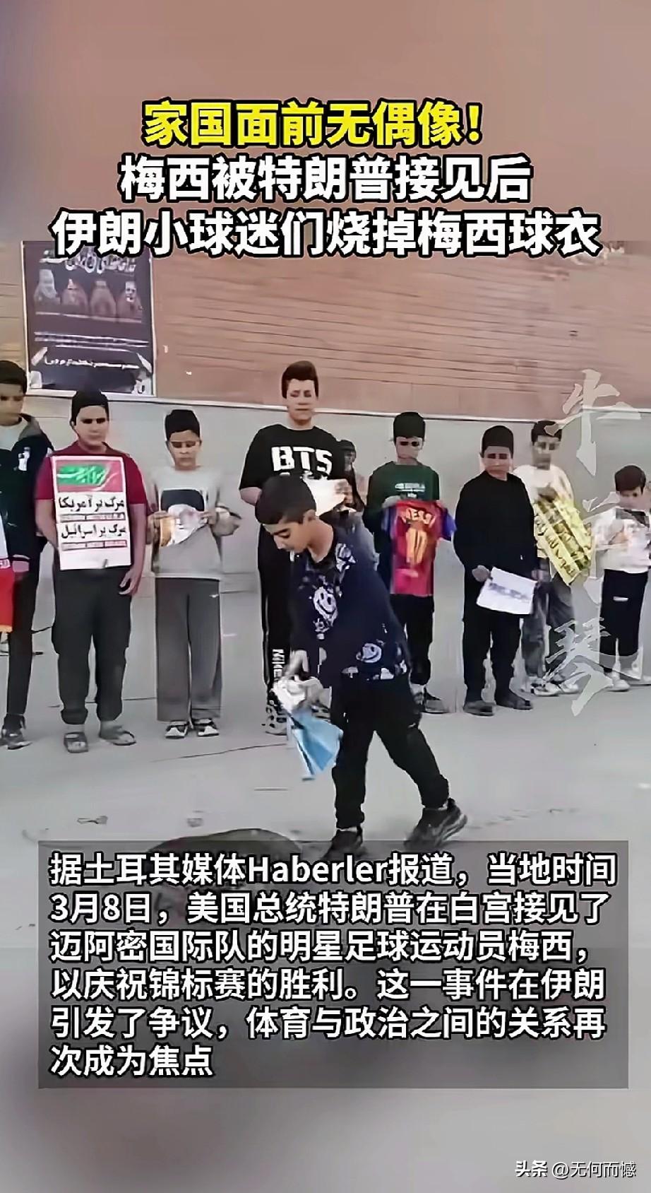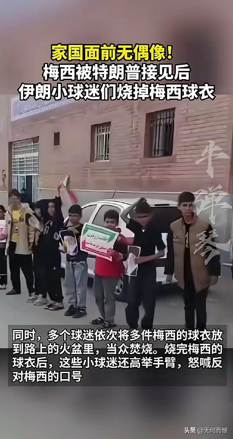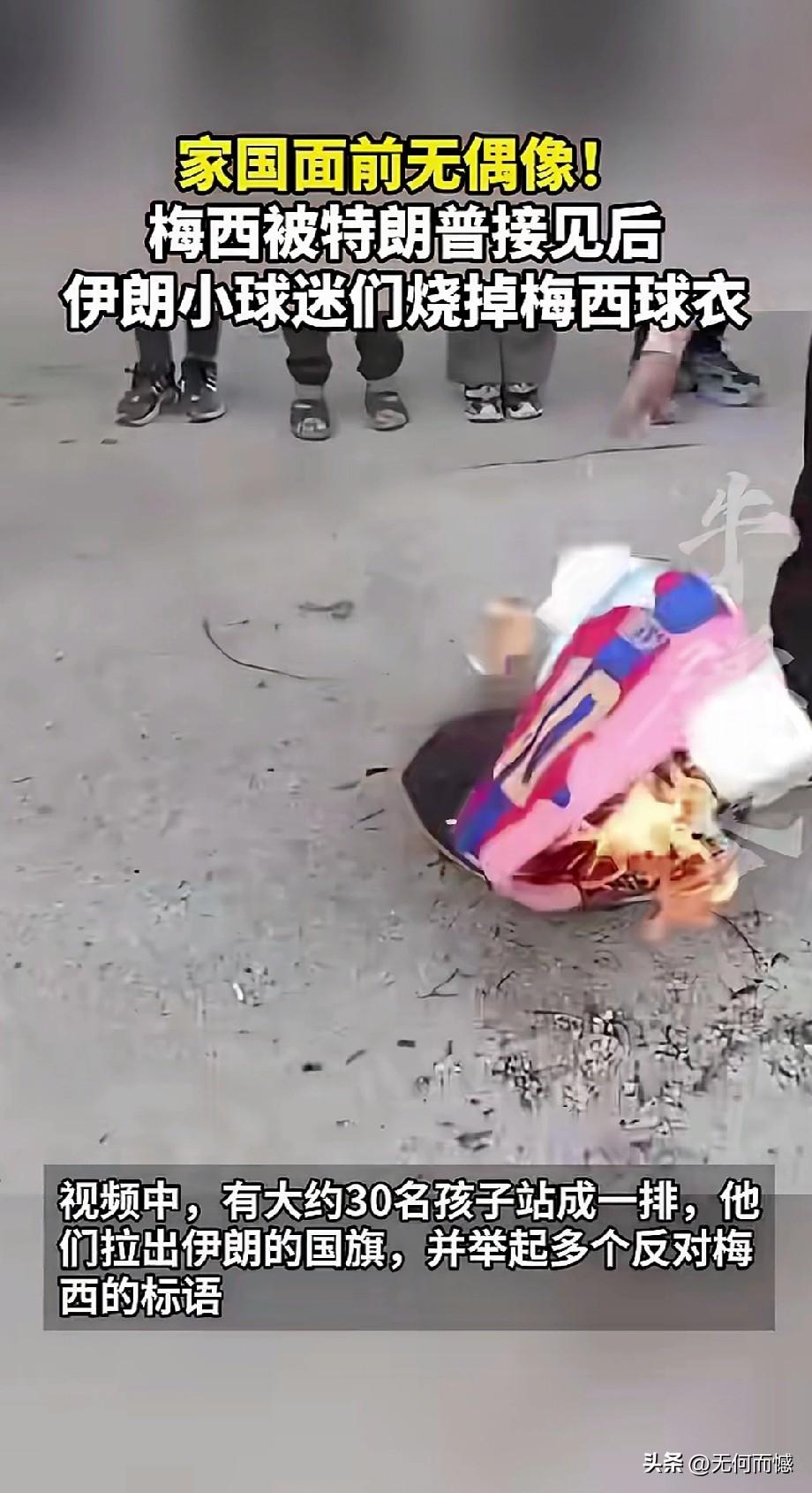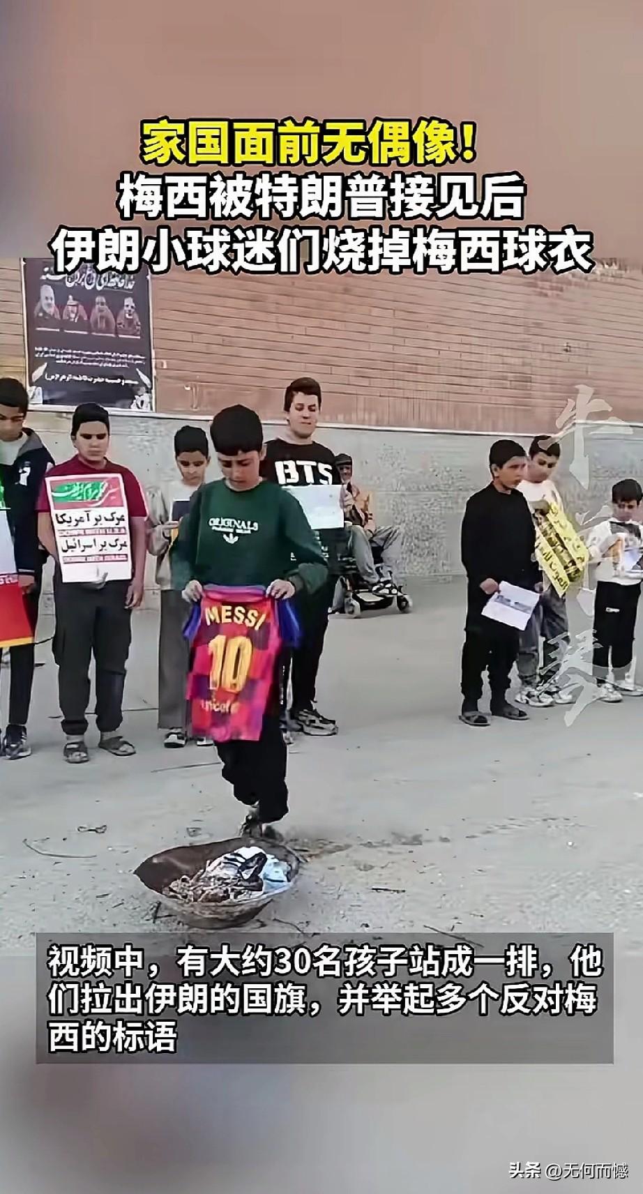 足球运动员梅西被老特接见之后,伊朗的小球迷愤怒了,他们举起反对梅西的标语,依次将多件梅西的球衣放进路上的火盆里,当众进行了焚烧,焚烧完梅西的球衣之后,这些小球迷高举手臂,怒喊反对梅西的标语!不知道梅西看到这样的画面,会做出怎样的感想,也许他根本就没有意识到会发生这样的事情!