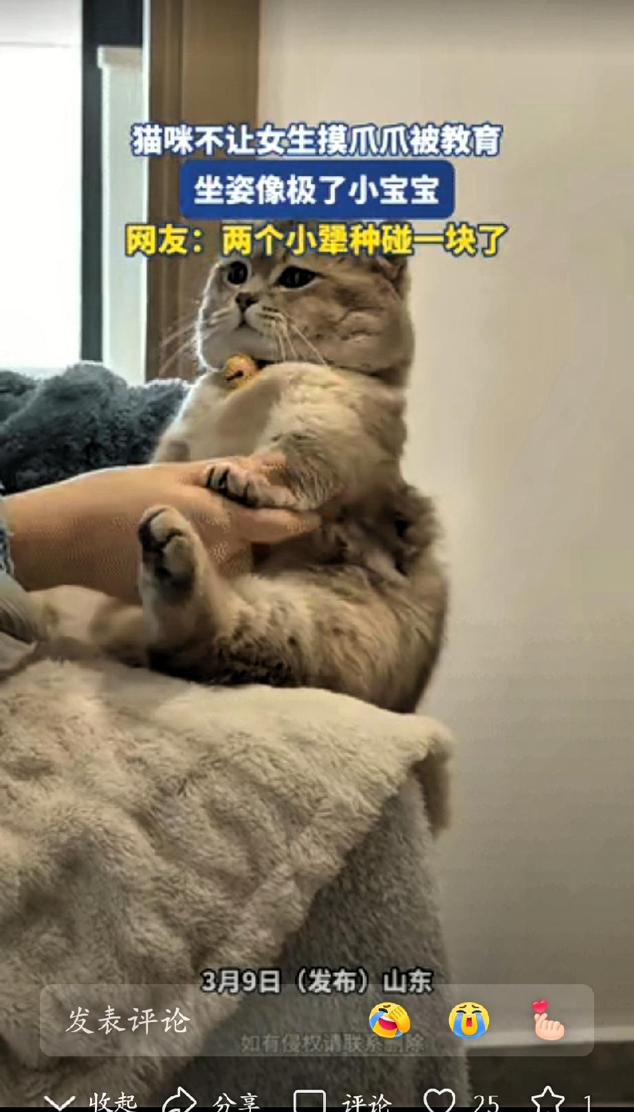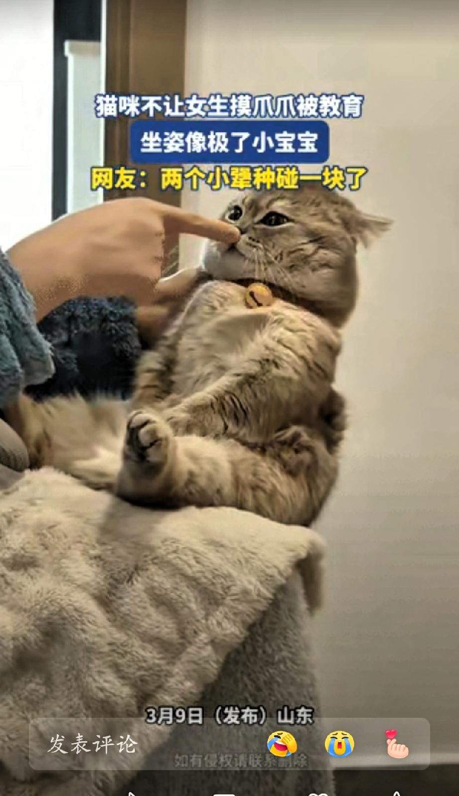 笑不活了,山东,一女生想摸摸自家猫咪的爪爪,不料猫咪却不让,下意识地躲开,显得有些小倔强。女生没有生气,也没有强硬地去触碰,而是把猫咪抱到腿上,用很温和的语气和它沟通,像是在和小朋友讲道理一样,耐心又温柔。 让人意外的是,猫咪好像真的听懂了主人的意思,立刻端正地坐好,两只前爪自然并拢,身体挺直,神情安静又乖巧。刚才还有些小脾气的模样瞬间消失,取而代之的是一副认真听话的样子,前后反差十分可爱。 不少网友看完都表示很有共鸣,觉得这一人一猫性格都很倔强,却又彼此包容,相处模式轻松又温馨。很多养宠的人都有类似的经历,小动物虽然不会说话,却能感知主人的情绪,愿意用自己的方式回应陪伴。 其实人与宠物之间最动人的,从来都不是多聪明的技能,而是互相理解、彼此迁就的温柔。主人用耐心对待小动物的小情绪,猫咪用信任回应主人的善意,这样简单平和的相处,正是生活里最珍贵的小美好。 现在大家生活节奏快,压力也不小,这样安静治愈的片段,很容易让人放松心情。没有冲突,没有炒作,只有真实、温暖、充满烟火气的日常,这也是大家愿意点赞和转发的原因。 生活本就由无数小事组成,一份耐心,一份温柔,一份陪伴,就足以让平凡的日子变得柔软又美好。