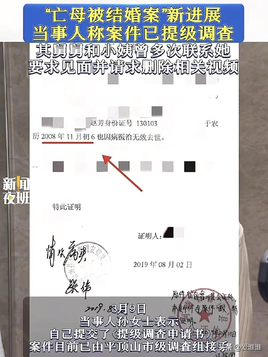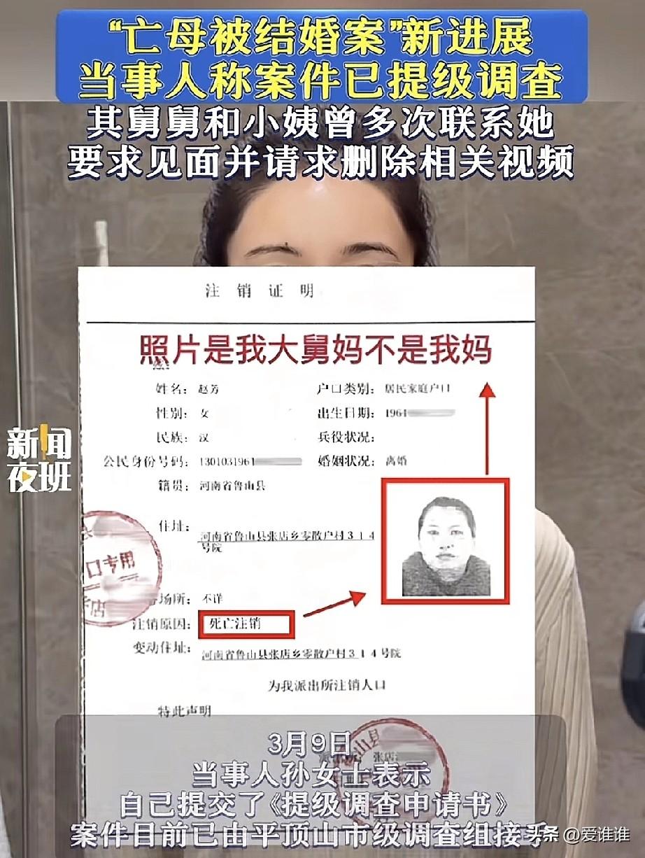 河南鲁山女子孙女士在社交媒体上实名举报称,自己的母亲于2008年病逝后,身份信息遭人冒用,不仅“死而复生”与他人办理了结婚登记,名下房产也在母亲去世后不久便被出售,而这场冒名婚姻的另一方,竟是她的亲舅舅。 2008年农历十一月初六,孙女士的母亲赵某因病去世,那一年,孙女士年仅9岁,按照家人的安排,她被指定由小姨抚养,离开了原来的生活轨迹。 此后的近十年里,孙女士渐渐长大,但对母亲的记忆并未淡去,直到2018年,她前往公证处,准备继承母亲留下的遗产时,才发现事情远没有她想象中那么简单。 公证员在审核材料后告诉孙女士,她并非母亲唯一的子女,原因是,在她的母亲赵某名下,存在一段2009年的婚姻登记记录。 这让孙女士感到错愕,母亲明明在2008年就已经下葬,怎么可能在一年后与人结婚? 公证处随后出具了一份终止公证决定书,决定书中写道,被继承人赵某于农历2008年11月初六死亡,经核实,发现其于2009年登记结婚,根据相关规定,公证处决定终止办理继承公证。 为了弄清真相,孙女士开始着手查询母亲的婚姻登记信息,她找到了一份2009年12月25日的申请结婚登记声明书。 声明书上,女方的名字确实是她的母亲赵某,但粘贴的照片却是另一个女人的面孔,那是她的舅妈,而男方一栏的信息显示,结婚对象是赵某品,正是孙女士的亲舅舅。 据孙女士了解,赵某品曾任鲁山县政法委副书记,属于当地公职人员,而在这段冒名婚姻登记之后,二人名下还有其他子女的信息记录。 随着调查深入,孙女士发现,母亲名下财产的变动,早在她去世不久后便已经开始。 她查到的文件显示,2008年12月17日,也就是母亲去世后的第14天,有人以赵某的名义办理了一份委托书及律师见证书,委托对象正是孙女士的小姨,两天后,母亲位于石家庄的一处房产被售出,房款由小姨收取。 这意味着,在母亲刚刚入土为安时,她名下的资产已经开始悄然转移。 孙女士将自己的遭遇发布在社交媒体上后,迅速引发广泛关注,面对舆论压力,当地有关部门介入调查。 她透露,事件发酵后,舅舅和小姨曾多次联系她,希望见面谈谈,并请求她删除相关视频,但她态度坚决,明确表示不接受任何形式的私下和解。 “我的诉求非常明确,要求依法追究相关人员的刑事责任,以及背后可能存在的公职人员法律责任。”孙女士说。 2025年3月3日凌晨,鲁山县委、县政府发布通报称,已成立由纪委监委牵头,公安、民政等部门组成的联合调查组展开调查。 不过,孙女士对县级调查的独立性存有疑虑,她认为,案件的核心行为发生在鲁山当地,且涉及公职人员,担心调查难以排除地方干扰。为此,她提交了《提级调查申请书》,请求由更高层级介入。 3月9日,她向媒体证实,案件已由平顶山市成立联合调查组提级办理,不再由县级层面主导,目前,她正在等待市级调查组的进一步约谈。 同日上午,有媒体就调查进展联系鲁山县民政局,工作人员表示不清楚案件已提级调查,对于近期的调查结果,需向上级请示后方可答复。截至发稿,尚未收到进一步回应。 针对外界对她母亲赵某所留珠宝资金来源的质疑,孙女士也作出了说明。 她说,这些珠宝是她和母亲当年一同前往广东进货,亲手挑选原石、找人加工,再用麻袋扛回石家庄售卖的,母亲买了不少珠宝鉴赏的书籍,那些年一直在坚持学习。 她同时表示,如果经相关部门调查核实,这批珠宝对应的资金确实来自舅舅,她愿意自愿放弃对该部分遗产的继承权。 如今,这起跨越十余年、牵涉亲情与法律的纠纷,仍在等待一个最终的调查结果!