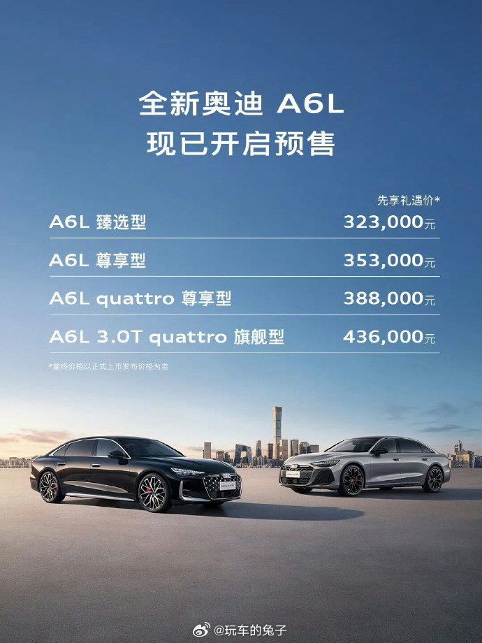 奥迪A6L的预售32.3万起,不少人看完都觉得有点贵,特别是拿现款A6L去比,那实际成交价格,直接就贵了好几万。这其实是一件情理之中的事情。因为奥迪也很清楚,虽然A6L从来不缺等降价的人,但更不缺想要尝鲜的人。这车不像奥迪A5L那样,上面有A6L压着,下面还有低价的A4L在顶着价格下限,它最多就是和隔壁的A7L竞争一下,而且彼此之间的竞争还不激烈,毕竟A7L从定位、造型到用户群,跟A6L都不是一类人。这时候,再加上S90和CT6销量疲软,5系造型不够稳重,奔驰E级价格坚挺,奥迪A6L还就成了独一份的产品。所以,这也就促使它在上市初期,没有理由也没有必要去把价格压低,先放个预售价探探风,再结合市场情况,通过经销商去慢慢的给到价格优惠,这也是奥迪这么多年一直在用的模式,也就是先卖新鲜感,再卖性价比。说到底,车是好车,不管外形、内饰、动力都可圈可点,你要是想买便宜的A6L,那就看看现款,如果想要尝鲜,而且资金充裕,那就坐等新款。至于配置怎么选,我个人还是更倾向于四驱版,甚至直接上3.0T版本,这才是A6L的灵魂,也是A6L的核心价值点。我与汽车的日常汽车全新一代奥迪a6l奥迪a6l奥迪全新一代奥迪a6l开启预售