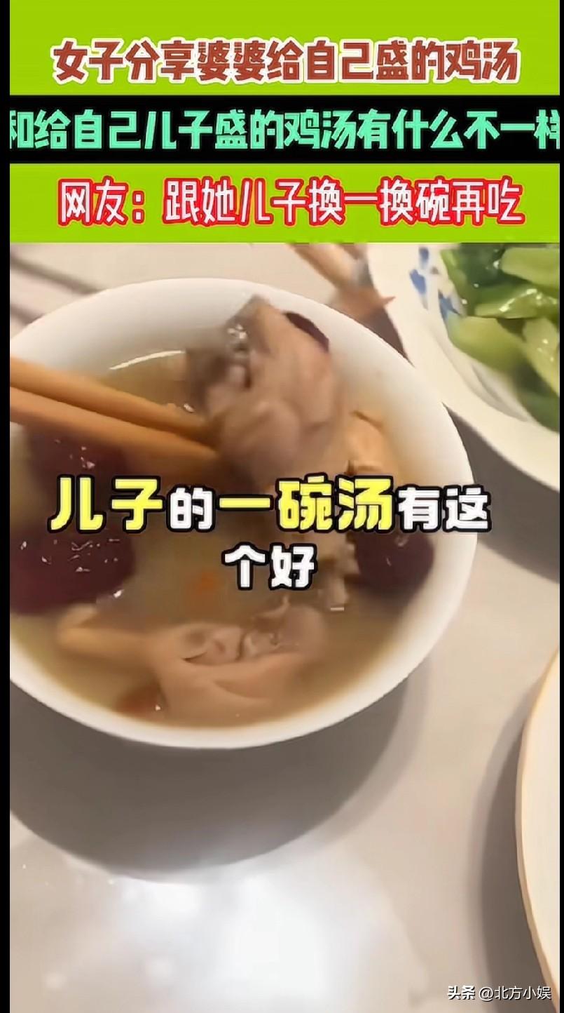 这婆婆不知道是感谢她呢,还是埋怨她!婆婆煮了一锅的鸡汤,给儿子、媳妇都盛了一碗,儿媳妇看看了自己的碗里,都是没什么肉的鸡脖子、鸡的碎骨头。但是丈夫的碗里,却是鸡大腿和大块的鸡肉。这一对比,差距简直是太明显了。 有的网友指责儿媳妇事太多。给你们做饭还竟事,能给你碗汤就应该感恩。我要是婆婆就不给舀碗里,自己去盛,想吃啥舀啥,盛碗里就差喂了,还是不满意,这不是吃饱撑的没事干嘛,出力不讨好的,做婆婆真难怎么做都是不对。 也有的网友说:挺好的了,我坐月子,都没喝上一碗母鸡汤,婆婆给买两个猪蹄,咬不动嘎吱嘎吱的响,根本不熟,和她说了,她说熟了,我整个月子里就吃两个没熟的猪蹄[捂脸],还有就是奶奶买的笨鸡蛋,我觉得挺好了,毕竟不是自己的妈妈。 还有的网友说:每次家里买排骨都是我买,婆婆都是每人一碗盛好,有一次老公不爱吃,就把他那碗给我吃,婆婆不太愿意也没说什么,我吃起来吃发现老公碗里全是小排,公公吐出来的也都是小排骨头,只有我碗里是那种碎肉和大骨头的排骨,我不敢相信她是这种人,当时真的很心寒!这么些年从未想过她会区别对待我。真心换不来真心的。 我觉得,这位婆婆偏向儿子是可以理解的,母亲都爱自己的孩子,不可能去爱别人的孩子。但是这种做法又欠妥,你自己的孩子是宝贝,人家也是妈妈的宝贝!不能做到一视同仁,但也不能区别对待啊! 大家觉得呢?