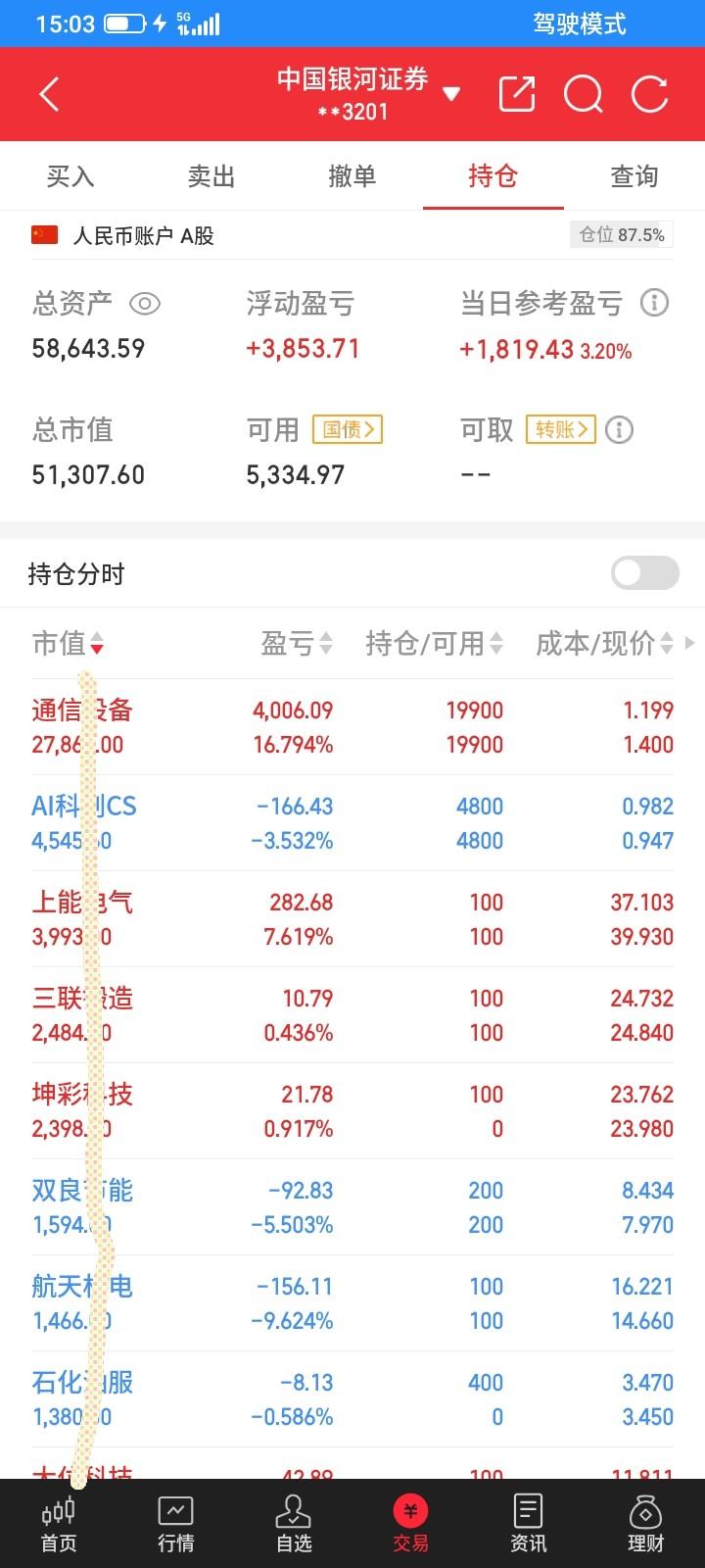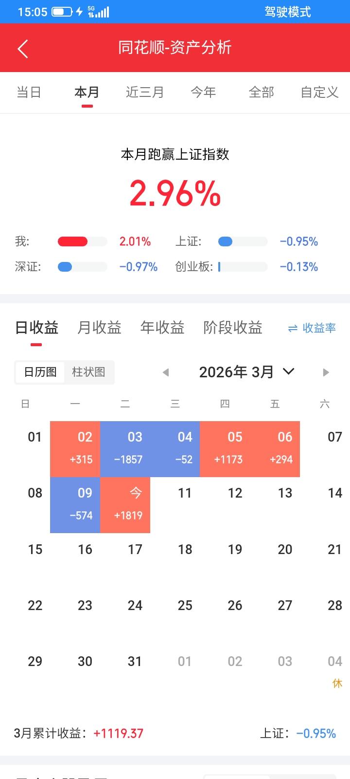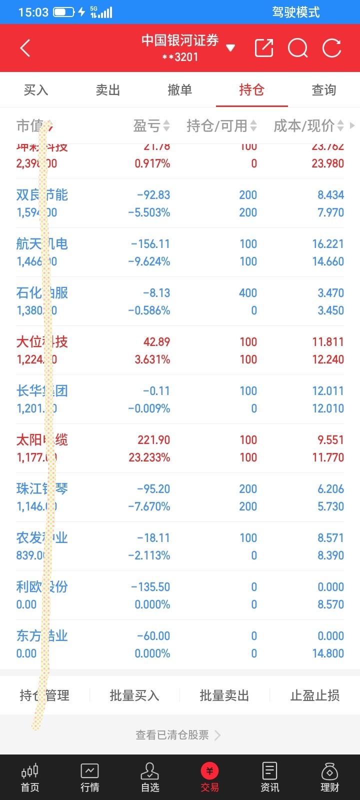 2026.03.10,今天上证指数继续昨天的反弹上涨,大部分股票都上涨,但是我持有的股票是属于下跌的那小部分,加上今天买入的,一共持有13只股票,却有5只股票下跌,只有8只勉强翻红反弹了一点点,2只etf反弹上涨,重仓的通信设备涨幅比较大,但是交易的策略是网格交易,上涨也只是浮盈,也不会全部卖掉,没有实际赚到钱,只是账户浮盈好看一点而已,卖掉了怕踏空了,还是按照计划做吧。 昨天止损卖掉的坤彩,钢琴,长华,都卖错了,今天都反弹上涨了,钢琴昨天已经反弹买回来200股了,今天上涨不再买了,不然成本更高,下跌又亏得更多了。 坤彩早上低开低走,下跌一点点,马上反弹上涨,反弹中条件单触发了,自动委托23.76买入100股,但是上涨太快,没有成交,很快冲高到24.35元很想追高买入,但是还是管住了手,后来还真冲高回落,下跌中成交了,成交后又继续下跌,买贵了一点点,但是方向还是对的,收盘浮盈20块钱。 长华高开高走,没有触发反弹买入的条件单,收盘还是收阳线,按照计划,高价重新买回来,收盘以12.01买回来100股,成本又比昨天高了30多块钱,又是低卖高买。 农发低开低走,又触底反弹,反弹中触发了条件单,自动以8.57又买回来100股,又买在最高价,买错了,亏了18块钱。 计划再新建仓一只股票,油服反弹中自动以3.47买入400股,成交之后最高冲到3.50元,但是反弹无力又跌下来了,收盘亏了8块钱。 前天买入的锆业今天高开低走,收阴线,浮盈变成了亏损,亏损就要及时止损,收盘以14.80元清仓止损卖掉100股,亏了60多块钱,昨天卖还少亏一点点,早上高开又是浮盈,最终变成实亏。明天反弹上涨再买回来。 利欧也是高开低走,下跌了一点点,收阴线,放弃幻想,及时止损,收盘以8.57元清仓止损卖掉200股,亏了130多块钱。明天反弹上涨再买回来吧。 太阳今天高开高走,然后逐步下跌,最低跌到11.30,然后触底反弹,一下子拉高了7个多点,但是都没有涨停,又跌下来了,差几分钱触发了止损条件单,收盘又拉起来一点,收阳线,没有触发止损也还是收阳线,就继续持有,明天下跌再卖。 上能低开低走,然后触底反弹,收盘下跌了一点点,但是还是收阳线,也没有触发止损单,就继续持有。 大位高开低走,然后触底反弹,收盘上涨几分钱,收假阴线,没有触发止损条件单,也就当阳线处理吧,继续持有,明天下跌再卖。 航天,双良,三联,钢琴都反弹上涨收阳线,继续持有。 科创etf反弹上涨,还没有回本,继续持有,不加仓也不减仓。 通信设备etf早上大幅高开,怕又是高开低走,集合竞价委托以1.364卖出1000股,但是以1.361开盘,马上撤单,但是9.30还是成交了,卖在最低价了,到收盘收在1.400元,因为恐惧又少卖了36块钱。收盘上涨了0.062元,昨天买得太多,风险已经太大了,所以早上卖掉1000股就不计数了,收盘还是网格交易,按照比例,收盘以1.400卖掉6100股,还有19900股,让利润继续奔跑,这只etf真不错,一只没有清仓,浮盈3999.9元了,浮盈浮亏,差一毛钱赚到4千了,希望继续上涨,赚一把大的。上涨继续卖出,下跌再买回来。 今天清仓2只股票,又新建仓买入4只股票,现在一共还持有2只etf,11只股票,这段时间又在这十多只股票中不断交易吧。 今天总市值5.13万元,总资产5.86万元,贷款0.51万元,净总资产5.36万元,把去年亏掉的钱终于暂时赚回来了,今天总体账户反弹回本1819元。这个月终于扬眉吐气了,账户翻红了,浮盈1000块钱左右。明天继续好运吧。