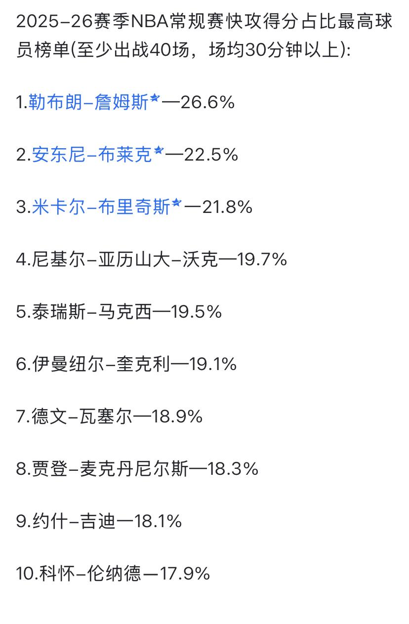 奇怪!詹姆斯成快攻榜中唯一未进抢断榜的。 榜中基本全是小年轻,就他和小卡、马克西算全明星级别的。后俩人都是抢断高手自己断自己快攻。 他呢?全是不防守的偷下吧,哈哈。快攻占比快到30%了,真是技术的体现! 他现在就会快下和撞大运的后仰,之前撞大运的3分本赛季也不灵了。