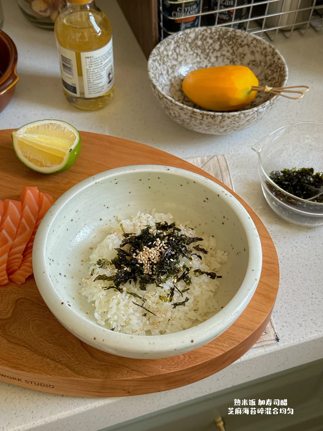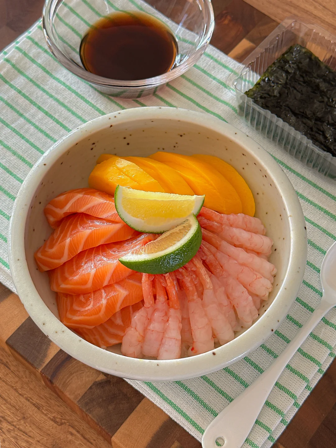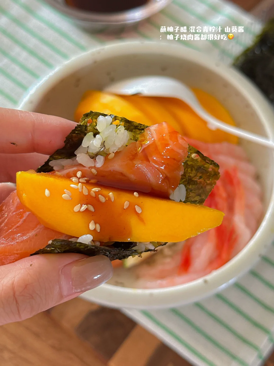 馋寿司饭🍣自己在家做 这样真的超简单又好吃😋 不开火 切一切好省事 淋一些青柠汁🍋🟩山葵酱和刺身酱汁就很很很美味了 - 紫菜散寿司真的就一口沦陷 拌在一起就是一碗夏日清爽波奇饭 盒🐎食材不到50r 完爆日料店❗️