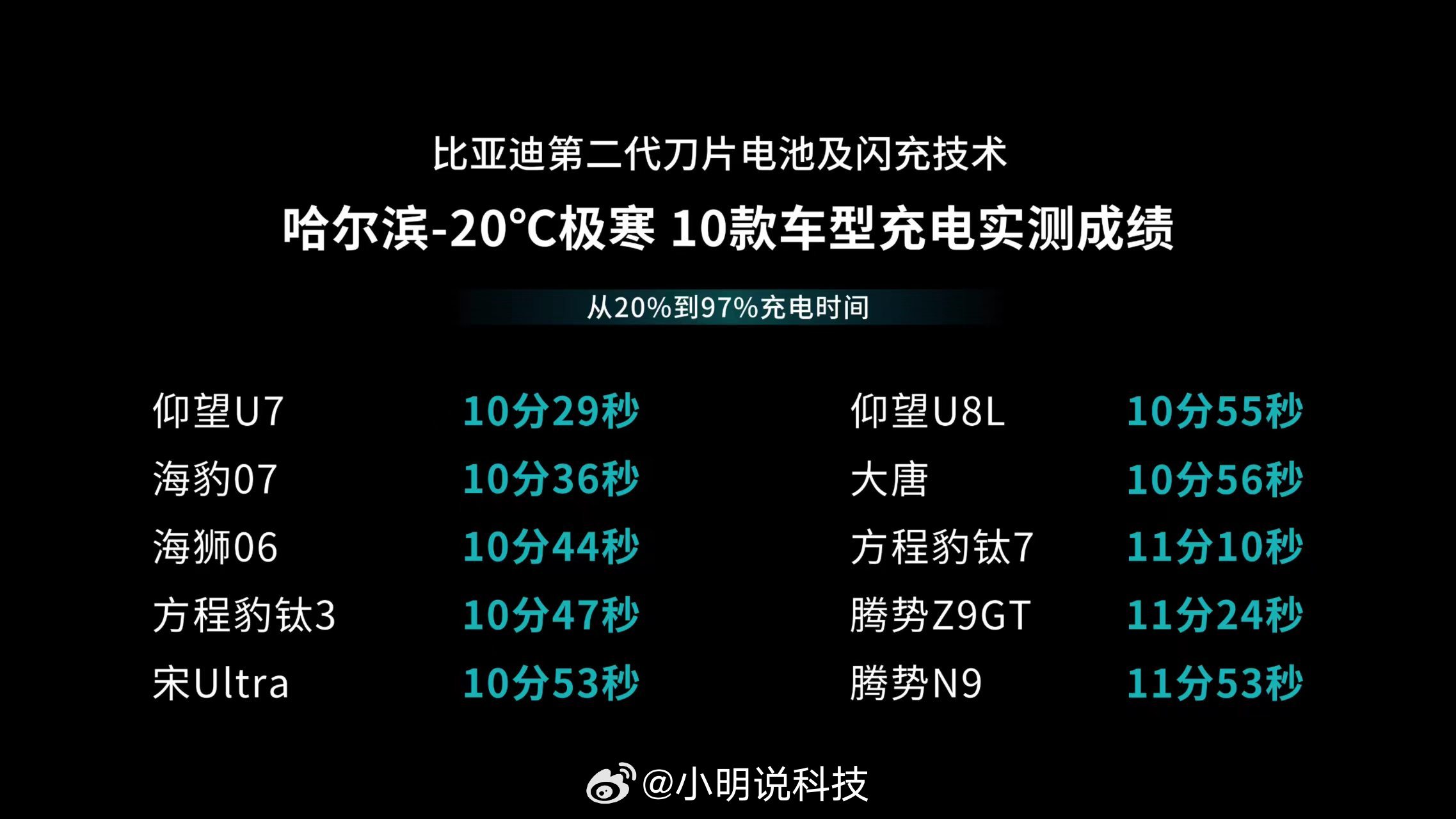 现在,比亚迪第二代刀片电池搭配全新闪充技术,彻底解决了这些痛点。常温下5分钟快速补能,9分钟即可充满;即便在-30℃极寒环境,充电时长也只多3分钟,直接打破“电车不过山海关”的魔咒。