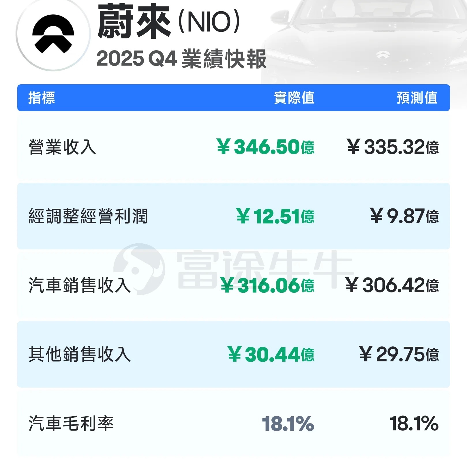 蔚来 2025年第四季度盈利12.51亿,盘前拉升涨超6%。