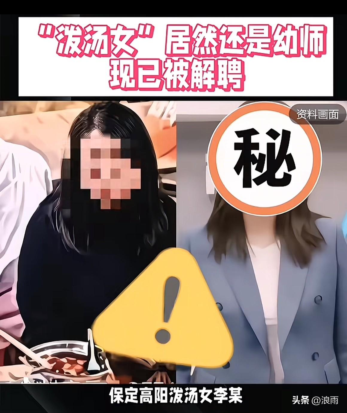 河北保定“泼汤女”职业曝光,已被开除。 泼汤女子没想到事情竟然会变的如此严重了。一开始事情被曝光后,她并不以为然,所以道歉也是轻飘飘的,显然没有拿这个事情当回事。 她以为自己已经道了歉,而且还赔了对方钱,事情就结束了, 没想到,在3月7号被传唤处理后,仅仅过了一天,3月9号就接到了单位的解聘通知。 据了解,泼汤女子是当地一所民办幼儿园的老师,已经任职了5年。因为这件事被火速解雇,幼儿园给出的理由是师德不佳。 这下子,泼汤女子是赔了夫人又折兵,真是悔不当初。