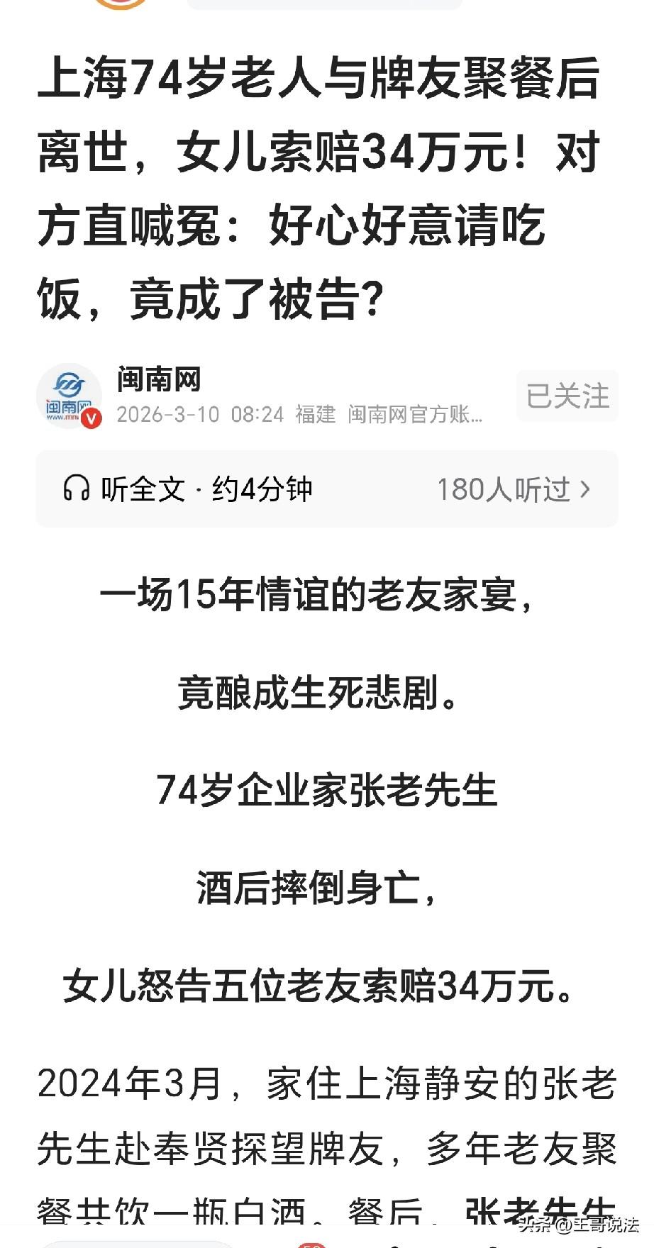 “谁死谁有理?”上海,一74岁大爷去看望老朋友,几个人聚餐,共饮了一瓶酒,吃完饭后,大爷要去打牌,老友骑电动车将他送到棋牌室门口,不料,大爷突然摔倒,抢救无效死亡,女儿跳出来不愿意了,她说老友们有三大过错: 一是未安全送父亲回家,二是醉酒未尽到看护责任,三是延误治疗抢救!女儿告到法院,向5位老友索赔34万,老友们急了: 好心好意请吃饭,竟成了被告? 张大爷已经74岁,他年轻的时候,是一位企业家,如今他上了年纪,在家养老,可是,他不服老,想起来自己多年前的几位牌友。 可牌友们离他很远,大爷住在静安,老友们都在奉贤,大爷心想,这点距离难不倒我,他立刻起身,就到奉贤去会老友。 他到了之后,老友们齐聚一堂,他们边吃边聊,聊到高兴,几个人共饮了一瓶白酒。 喝完酒后,他们依依不舍,几个人相约,去棋牌室再打几圈。 老友骑电动车将他送到棋牌室的门口,可万万没有想法,意想不到的事情发生了。 张大爷喝完酒后,他有些醉了,走起路来,他摇摇晃晃,可是他一心想要打牌,不管不顾就往棋牌室走去。 可是还没等进去,只听见扑通一声,他应声摔倒,躺在了地上,一动不动了。 朋友们急了,立刻打120急救,急救车呼呼赶来,立刻将大爷送到了医院。 可到了医院,医生们尽了全力,还是没能将大爷抢救回来,大爷去世,原因是硬膜下血肿导致身亡。 张大爷的女儿接到了通知,她心急火燎就赶到了医院,可是,等着她的是父亲的遗体,父亲变得冰凉,张女士嚎啕大哭。 几位老友们经过商量,为了避免麻烦,他们告诉女儿,他们在一起喝酒,张大爷只喝了有三两酒。 他们还说,他们将张大爷送回了家里,压根没提棋牌室的事情。 可张女士感觉蹊跷,她到警方查看了监控,她这才知道,父亲是在棋牌室的门口摔倒的。 张女士火冒三丈,她想不明白,这5个父亲的老友为何要对自己撒谎? 在她看来,父亲的死亡和这几个人脱不开干系,于是她指出,老友们犯了三大错误! 第一是父亲喝醉,老朋友们并未安全送父亲回家,而是在他醉酒的情况下,将他送到了棋牌室的门口。 第二,老友们明知道父亲已经喝醉,却没有对他好好照顾,未尽到看护责任,因此老友们犯了错误! 第三,父亲摔倒之后,老友们没有及时抢救,而是延了2小时才进行了抢救。 因此,张女士认为,父亲的死和这几个人脱不了干系,她一直诉状,将5个老友告到了法院。 可老友们大喊冤枉,说张大爷在聚餐时只喝了三两,他没有喝醉,大家还劝他少喝一点。 吃完饭后,也是他自己要去棋牌室里打牌,也是他自己摔倒,和别人没有任何的关系。 法院经过调查,发现张大爷的确在就餐后喝醉了,并且,是老友们将他送到了棋牌室门口,并没有把他送回家里,老友们也不知道张大爷的具体地址。 因此,法院认为,几位老友对张大爷在照顾和护送上存在微小瑕疵。 另外,张大爷摔倒之后,从就医时间来看,张大爷是在7点10分摔倒,8点15就到了医院,去掉路上的损耗,不存在延迟抢救的事实。 另外,67岁的吴阿婆和陈先生并没有参与打牌,他们提前走了,不在现场,因此他们不用担责。 《民法典》第1165条规定,行为人因过错侵害他人权益造成损害的,应当承担侵权责任。 法院判决,张大爷作为完全民事行为能力人,对自身安全未尽到注意义务,对自己的死亡,应承担主要责任。 3名同饮者,对张大爷未尽到合理照顾与护送义务,存在轻微过错,应承担5%责任。 其中组织者赵某承担3%,另两名老友各承担1%,合计需赔偿17000元。 那么,看谁还敢和别人一起喝酒?尤其是上年纪的老人,俗话说的好,七十不留宿,八十不留饭,吸取教训吧! 对此,你怎么看?